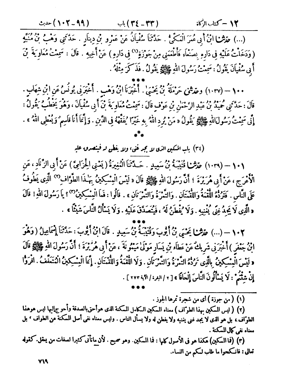 ١٠١ - (١٠٣٩) حَدَّثَنَا قُتَيْبَةُ بْنُ سَعِيدٍ، حَدَّثَنَا الْمُغِيرَةُ يَعْنِي الْحِزَامِيَّ، عَنْ أَبِي الزِّنَادِ، عَنِ الْأَعْرَجِ، عَنْ أَبِي هُرَيْرَةَ، أَنَّ رَسُولَ اللهِ صَلَّى اللهُ عَلَيْهِ وَسَلَّمَ، قَالَ: «لَيْسَ الْمِسْكِينُ بِهَذَا الطَّوَّافِ الَّذِي يَطُوفُ عَلَى النَّاسِ، فَتَرُدُّهُ اللُّقْمَةُ وَاللُّقْمَتَانِ، وَالتَّمْرَةُ وَالتَّمْرَتَانِ» قَالُوا، فَمَا الْمِسْكِينُ؟ يَا رَسُولَ اللهِ، قَالَ: «الَّذِي لَا يَجِدُ غِنًى يُغْنِيهِ، وَلَا يُفْطَنُ لَهُ، فَيُتَصَدَّقَ عَلَيْهِ، وَلَا يَسْأَلُ النَّاسَ شَيْئًا»