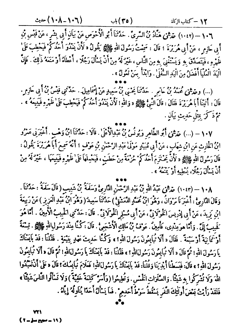 ١٠٦ - (١٠٤٢) حَدَّثَنِي هَنَّادُ بْنُ السَّرِيِّ، حَدَّثَنَا أَبُو الْأَحْوَصِ، عَنْ بَيَانٍ أَبِي بِشْرٍ، عَنْ قَيْسِ بْنِ أَبِي حَازِمٍ، عَنْ أَبِي هُرَيْرَةَ، قَالَ: سَمِعْتُ رَسُولَ اللهِ صَلَّى اللهُ عَلَيْهِ وَسَلَّمَ، يَقُولُ: «لَأَنْ يَغْدُوَ أَحَدُكُمْ، فَيَحْطِبَ عَلَى ظَهْرِهِ، فَيَتَصَدَّقَ بِهِ وَيَسْتَغْنِيَ بِهِ مِنَ النَّاسِ، خَيْرٌ لَهُ مِنْ أَنْ يَسْأَلَ رَجُلًا، أَعْطَاهُ أَوْ مَنَعَهُ ذَلِكَ، فَإِنَّ الْيَدَ الْعُلْيَا أَفْضَلُ مِنَ الْيَدِ السُّفْلَى، وَابْدَأْ بِمَنْ تَعُولُ»
