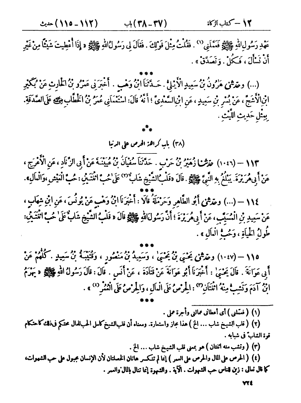١١٤ - (١٠٤٦) وحَدَّثَنِي أَبُو الطَّاهِرِ، وَحَرْمَلَةُ، قَالَا: أَخْبَرَنَا ابْنُ وَهْبٍ، عَنْ يُونُسَ، عَنِ ابْنِ شِهَابٍ، عَنْ سَعِيدِ بْنِ الْمُسَيِّبِ، عَنْ أَبِي هُرَيْرَةَ، أَنَّ رَسُولَ اللهِ صَلَّى اللهُ عَلَيْهِ وَسَلَّمَ، قَالَ: " قَلْبُ الشَّيْخِ شَابٌّ عَلَى حُبِّ اثْنَتَيْنِ: طُولُ الْحَيَاةِ، وَحُبُّ الْمَالِ "