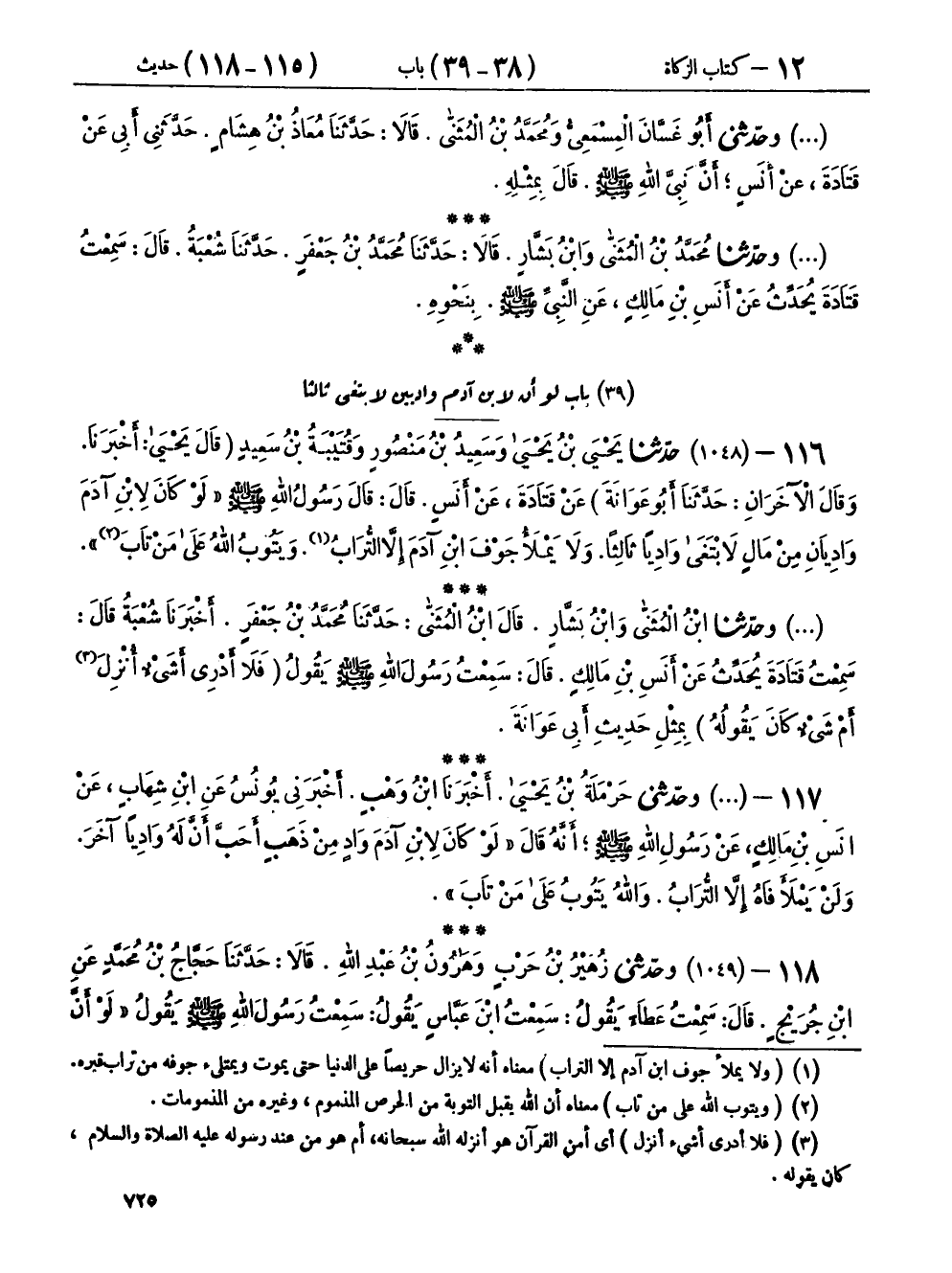 ١١٦ - (١٠٤٨) حَدَّثَنَا يَحْيَى بْنُ يَحْيَى، وَسَعِيدُ بْنُ مَنْصُورٍ، وَقُتَيْبَةُ بْنُ سَعِيدٍ، - قَالَ يَحْيَى: أَخْبَرَنَا، وَقَالَ الْآخَرَانِ: - حَدَّثَنَا أَبُو عَوَانَةَ، عَنْ قَتَادَةَ، عَنْ أَنَسٍ، قَالَ: قَالَ رَسُولُ اللهِ صَلَّى اللهُ عَلَيْهِ وَسَلَّمَ: «لَوْ كَانَ لِابْنِ آدَمَ وَادِيَانِ مِنْ مَالٍ لَابْتَغَى وَادِيًا ثَالِثًا، وَلَا يَمْلَأُ جَوْفَ ابْنِ آدَمَ إِلَّا التُّرَابُ، وَيَتُوبُ اللهُ عَلَى مَنْ تَابَ»
