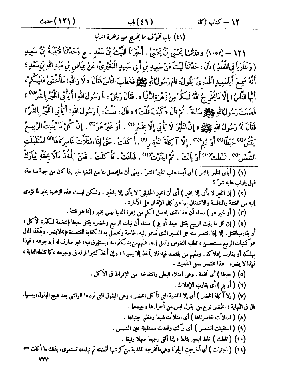 ١٢١ - (١٠٥٢) وحَدَّثَنَا يَحْيَى بْنُ يَحْيَى، أَخْبَرَنَا اللَّيْثُ بْنُ سَعْدٍ، ح وَحَدَّثَنَا قُتَيْبَةُ بْنُ سَعِيدٍ - وَتَقَارَبَا فِي اللَّفْظِ - قَالَ: حَدَّثَنَا لَيْثٌ، عَنْ سَعِيدِ بْنِ أَبِي سَعِيدٍ الْمَقْبُرِيِّ، عَنْ عِيَاضِ بْنِ عَبْدِ اللهِ بْنِ سَعْدٍ، أَنَّهُ سَمِعَ أَبَا سَعِيدٍ الْخُدْرِيَّ، يَقُولُ: قَامَ رَسُولُ اللهِ صَلَّى اللهُ عَلَيْهِ وَسَلَّمَ فَخَطَبَ النَّاسَ فَقَالَ: «لَا وَاللهِ، مَا أَخْشَى عَلَيْكُمْ، أَيُّهَا النَّاسُ، إِلَّا مَا يُخْرِجُ اللهُ لَكُمْ مِنْ زَهْرَةِ الدُّنْيَا» فَقَالَ رَجُلٌ: يَا رَسُولَ اللهِ، أَيَأْتِي الْخَيْرُ بِالشَّرِّ؟ فَصَمَتَ رَسُولُ اللهِ صَلَّى اللهُ عَلَيْهِ وَسَلَّمَ سَاعَةً، ثُمَّ قَالَ: «كَيْفَ قُلْتَ؟» قَالَ: قُلْتُ: يَا رَسُولَ اللهِ، أَيَأْتِي الْخَيْرُ بِالشَّرِّ؟ فَقَالَ لَهُ رَسُولُ اللهِ صَلَّى اللهُ عَلَيْهِ وَسَلَّمَ: «إِنَّ الْخَيْرَ لَا يَأْتِي إِلَّا بِخَيْرٍ، أَوَ خَيْرٌ هُوَ، إِنَّ كُلَّ مَا يُنْبِتُ الرَّبِيعُ يَقْتُلُ حَبَطًا أَوْ يُلِمُّ، إِلَّا آكِلَةَ الْخَضِرِ، أَكَلَتْ، حَتَّى إِذَا امْتَلَأَتْ خَاصِرَتَاهَا اسْتَقْبَلَتِ الشَّمْسَ، ثَلَطَتْ أَوْ بَالَتْ، ثُمَّ اجْتَرَّتْ، فَعَادَتْ فَأَكَلَتْ فَمَنْ يَأْخُذْ مَالًا بِحَقِّهِ يُبَارَكْ لَهُ فِيهِ، وَمَنْ يَأْخُذْ مَالًا بِغَيْرِ حَقِّهِ فَمَثَلُهُ، كَمَثَلِ الَّذِي يَأْكُلُ وَلَا يَشْبَعُ»
