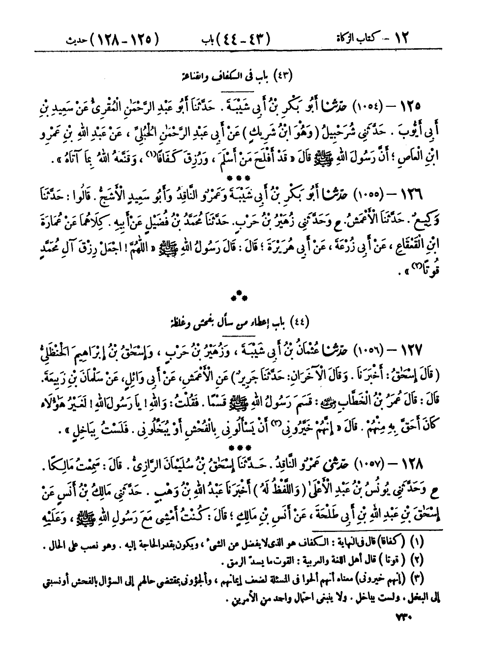 ١٢٦ - (١٠٥٥) حَدَّثَنَا أَبُو بَكْرِ بْنُ أَبِي شَيْبَةَ، وَعَمْرٌو النَّاقِدُ، وَأَبُو سَعِيدٍ الْأَشَجُّ، قَالُوا: حَدَّثَنَا وَكِيعٌ، حَدَّثَنَا الْأَعْمَشُ، ح وحَدَّثَنِي زُهَيْرُ بْنُ حَرْبٍ، حَدَّثَنَا مُحَمَّدُ بْنُ فُضَيْلٍ، عَنْ أَبِيهِ، كِلَاهُمَا عَنْ عُمَارَةَ بْنِ الْقَعْقَاعِ، عَنْ أَبِي زُرْعَةَ، عَنْ أَبِي هُرَيْرَةَ، قَالَ: قَالَ رَسُولُ اللهِ صَلَّى اللهُ عَلَيْهِ وَسَلَّمَ: «اللهُمَّ اجْعَلْ رِزْقَ آلِ مُحَمَّدٍ قُوتًا»