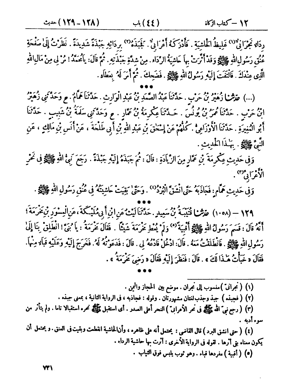 (١٠٥٧) حَدَّثَنَا زُهَيْرُ بْنُ حَرْبٍ، حَدَّثَنَا عَبْدُ الصَّمَدِ بْنُ عَبْدِ الْوَارِثِ، حَدَّثَنَا هَمَّامٌ، ح وحَدَّثَنِي زُهَيْرُ بْنُ حَرْبٍ، حَدَّثَنَا عُمَرُ بْنُ يُونُسَ، حَدَّثَنَا عِكْرِمَةُ بْنُ عَمَّارٍ، ح وحَدَّثَنِي سَلَمَةُ بْنُ شَبِيبٍ، حَدَّثَنَا أَبُو الْمُغِيرَةِ، حَدَّثَنَا الْأَوْزَاعِيُّ، كُلُّهُمْ عَنْ إِسْحَاقَ بْنِ عَبْدِ اللهِ بْنِ أَبِي طَلْحَةَ، عَنْ أَنَسِ بْنِ مَالِكٍ، عَنِ النَّبِيِّ صَلَّى اللهُ عَلَيْهِ وَسَلَّمَ بِهَذَا الْحَدِيثِ وَفِي حَدِيثِ عِكْرِمَةَ بْنِ عَمَّارٍ، مِنَ الزِّيَادَةِ: قَالَ: ثُمَّ جَبَذَهُ إِلَيْهِ جَبْذَةً، رَجَعَ نَبِيُّ اللهِ صَلَّى اللهُ عَلَيْهِ وَسَلَّمَ فِي نَحْرِ الْأَعْرَابِيِّ، وَفِي حَدِيثِ هَمَّامٍ فَجَاذَبَهُ حَتَّى انْشَقَّ الْبُرْدُ، وَحَتَّى بَقِيَتْ حَاشِيَتُهُ فِي عُنُقِ رَسُولِ اللهِ صَلَّى اللهُ عَلَيْهِ وَسَلَّمَ