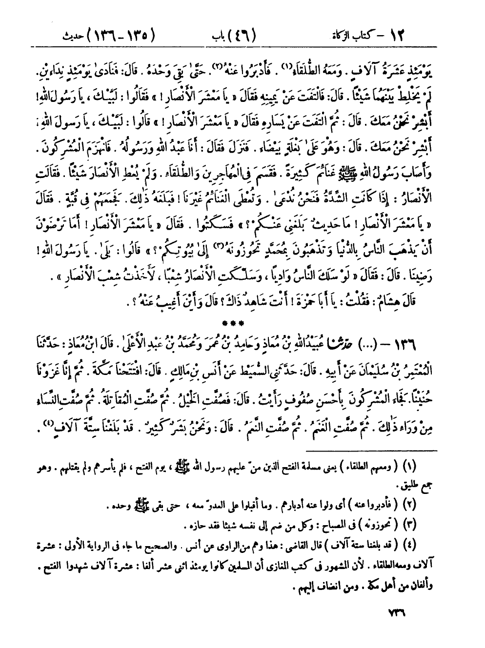 ١٣٦ - (١٠٥٩) حَدَّثَنَا عُبَيْدُ اللهِ بْنُ مُعَاذٍ، وَحَامِدُ بْنُ عُمَرَ، وَمُحَمَّدُ بْنُ عَبْدِ الْأَعْلَى، قَالَ: ابْنُ مُعَاذٍ، حَدَّثَنَا الْمُعْتَمِرُ بْنُ سُلَيْمَانَ، عَنْ أَبِيهِ، قَالَ: حَدَّثَنِي السُّمَيْطُ، عَنْ أَنَسِ بْنِ مَالِكٍ، قَالَ: افْتَتَحْنَا مَكَّةَ، ثُمَّ إِنَّا غَزَوْنَا حُنَيْنًا، فَجَاءَ الْمُشْرِكُونَ بِأَحْسَنِ صُفُوفٍ رَأَيْتُ، قَالَ: فَصُفَّتِ الْخَيْلُ، ثُمَّ صُفَّتِ الْمُقَاتِلَةُ، ثُمَّ صُفَّتِ النِّسَاءُ مِنْ وَرَاءِ ذَلِكَ، ثُمَّ صُفَّتِ الْغَنَمُ، ثُمَّ صُفَّتِ النَّعَمُ، قَالَ: وَنَحْنُ بَشَرٌ كَثِيرٌ قَدْ بَلَغْنَا سِتَّةَ آلَافٍ، وَعَلَى مُجَنِّبَةِ خَيْلِنَا خَالِدُ بْنُ الْوَلِيدِ، قَالَ: فَجَعَلَتْ خَيْلُنَا تَلْوِي خَلْفَ ظُهُورِنَا، فَلَمْ نَلْبَثْ أَنِ انْكَشَفَتْ خَيْلُنَا، وَفَرَّتِ الْأَعْرَابُ وَمَنْ نَعْلَمُ مِنَ النَّاسِ قَالَ: فَنَادَى رَسُولُ اللهِ صَلَّى اللهُ عَلَيْهِ وَسَلَّمَ «يَا لَلْمُهَاجِرِينَ، يَا لَلْمُهَاجِرِينَ» ثُمَّ قَالَ: «يَا لَلْأَنْصَارِ، يَا لَلْأَنْصَارِ» قَالَ: قَالَ أَنَسٌ: هَذَا حَدِيثُ عِمِّيَّةٍ قَالَ: قُلْنَا، لَبَّيْكَ يَا رَسُولَ اللهِ، قَالَ: فَتَقَدَّمَ رَسُولُ اللهِ صَلَّى اللهُ عَلَيْهِ وَسَلَّمَ، قَالَ: فَايْمُ اللهِ، مَا أَتَيْنَاهُمْ حَتَّى هَزَمَهُمُ اللهُ، قَالَ: فَقَبَضْنَا ذَلِكَ الْمَالَ، ثُمَّ انْطَلَقْنَا إِلَى الطَّائِفِ فَحَاصَرْنَاهُمْ أَرْبَعِينَ لَيْلَةً، ثُمَّ رَجَعْنَا إِلَى مَكَّةَ فَنَزَلْنَا، قَالَ: فَجَعَلَ رَسُولُ اللهِ صَلَّى اللهُ عَلَيْهِ وَسَلَّمَ يُعْطِي الرَّجُلَ الْمِائَةَ مِنَ الْإِبِلِ. ثُمَّ ذَكَرَ بَاقِيَ الْحَدِيثِ كَنَحْوِ حَدِيثِ قَتَادَةَ، وَأَبِي التَّيَّاحِ وَهِشَامِ بْنِ زَيْدٍ