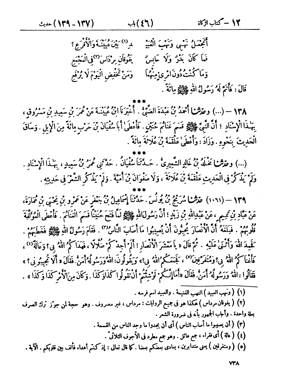 ١٣٨ - (١٠٦٠) وحَدَّثَنَا أَحْمَدُ بْنُ عَبْدَةَ الضَّبِّيُّ، أَخْبَرَنَا ابْنُ عُيَيْنَةَ، عَنْ عُمَرَ بْنِ سَعِيدِ بْنِ مَسْرُوقٍ، بِهَذَا الْإِسْنَادِ، أَنَّ النَّبِيَّ صَلَّى اللهُ عَلَيْهِ وَسَلَّمَ قَسَمَ غَنَائِمَ حُنَيْنٍ، فَأَعْطَى أَبَا سُفْيَانَ بْنَ حَرْبٍ مِائَةً مِنَ الْإِبِلِ، وَسَاقَ الْحَدِيثَ بِنَحْوِهِ. وَزَادَ: وَأَعْطَى عَلْقَمَةَ بْنَ عُلَاثَةَ مِائَةً.