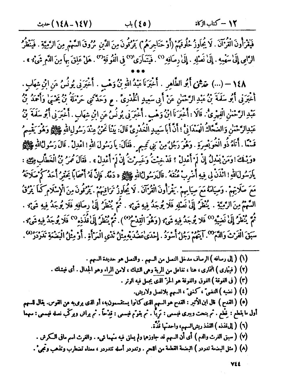 ١٤٨ - (١٠٦٤) حَدَّثَنِي أَبُو الطَّاهِرِ، أَخْبَرَنَا عَبْدُ اللهِ بْنُ وَهْبٍ، أَخْبَرَنِي يُونُسُ، عَنِ ابْنِ شِهَابٍ، أَخْبَرَنِي أَبُو سَلَمَةَ بْنُ عَبْدِ الرَّحْمَنِ، عَنْ أَبِي سَعِيدٍ الْخُدْرِيِّ، ح وحَدَّثَنِي حَرْمَلَةُ بْنُ يَحْيَى، وَأَحْمَدُ بْنُ عَبْدِ الرَّحْمَنِ الْفِهْرِيُّ، قَالَا: أَخْبَرَنَا ابْنُ وَهْبٍ، أَخْبَرَنِي يُونُسُ، عَنِ ابْنِ شِهَابٍ، أَخْبَرَنِي أَبُو سَلَمَةَ بْنُ عَبْدِ الرَّحْمَنِ، وَالضَّحَّاكُ الْهَمْدَانِيُّ، أَنَّ أَبَا سَعِيدٍ الْخُدْرِيَّ، قَالَ: بَيْنَا نَحْنُ عِنْدَ رَسُولِ اللهِ صَلَّى اللهُ عَلَيْهِ وَسَلَّمَ وَهُوَ يَقْسِمُ قَسْمًا، أَتَاهُ ذُو الْخُوَيْصِرَةِ، وَهُوَ رَجُلٌ مِنْ بَنِي تَمِيمٍ، فَقَالَ: يَا رَسُولَ اللهِ، اعْدِلْ، قَالَ رَسُولُ اللهِ صَلَّى اللهُ عَلَيْهِ وَسَلَّمَ: «وَيْلَكَ وَمَنْ يَعْدِلُ إِنْ لَمْ أَعْدِلْ؟ قَدْ خِبْتُ وَخَسِرْتُ إِنْ لَمْ أَعْدِلْ» فَقَالَ عُمَرُ بْنُ الْخَطَّابِ رَضِيَ اللهُ عَنْهُ: يَا رَسُولَ اللهِ، ائْذَنْ لِي فِيهِ أَضْرِبْ عُنُقَهُ، قَالَ رَسُولُ اللهِ صَلَّى اللهُ عَلَيْهِ وَسَلَّمَ: «دَعْهُ، فَإِنَّ لَهُ أَصْحَابًا يَحْقِرُ أَحَدُكُمْ صَلَاتَهُ مَعَ صَلَاتِهِمْ، وَصِيَامَهُ مَعَ صِيَامِهِمْ، يَقْرَءُونَ الْقُرْآنَ، لَا يُجَاوِزُ تَرَاقِيَهُمْ، يَمْرُقُونَ مِنَ الْإِسْلَامِ كَمَا يَمْرُقُ السَّهْمُ مِنَ الرَّمِيَّةِ، يُنْظَرُ إِلَى نَصْلِهِ فَلَا يُوجَدُ فِيهِ شَيْءٌ، ثُمَّ يُنْظَرُ إِلَى رِصَافِهِ فَلَا يُوجَدُ فِيهِ شَيْءٌ، ثُمَّ يُنْظَرُ إِلَى نَضِيِّهِ فَلَا يُوجَدُ فِيهِ شَيْءٌ - وَهُوَ الْقِدْحُ - ثُمَّ يُنْظَرُ إِلَى قُذَذِهِ فَلَا يُوجَدُ فِيهِ شَيْءٌ، سَبَقَ الْفَرْثَ وَالدَّمَ، آيَتُهُمْ رَجُلٌ أَسْوَدُ، إِحْدَى عَضُدَيْهِ مِثْلُ ثَدْيِ الْمَرْأَةِ، أَوْ مِثْلُ الْبَضْعَةِ تَتَدَرْدَرُ، يَخْرُجُونَ عَلَى حِينِ فُرْقَةٍ مِنَ النَّاسِ» قَالَ أَبُو سَعِيدٍ: «فَأَشْهَدُ أَنِّي سَمِعْتُ هَذَا مِنْ رَسُولِ اللهِ صَلَّى اللهُ عَلَيْهِ وَسَلَّمَ، وَأَشْهَدُ أَنَّ عَلِيَّ بْنَ أَبِي طَالِبٍ رَضِيَ اللهُ عَنْهُ قَاتَلَهُمْ وَأَنَا مَعَهُ، فَأَمَرَ بِذَلِكَ الرَّجُلِ فَالْتُمِسَ، فَوُجِدَ، فَأُتِيَ بِهِ، حَتَّى نَظَرْتُ إِلَيْهِ، عَلَى نَعْتِ رَسُولِ اللهِ صَلَّى اللهُ عَلَيْهِ وَسَلَّمَ الَّذِي نَعَتَ»