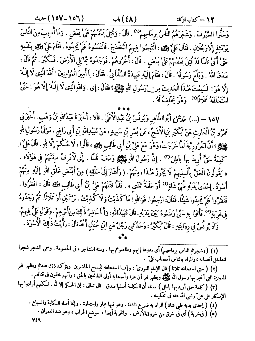 ١٥٧ - (١٠٦٦) حَدَّثَنِي أَبُو الطَّاهِرِ، وَيُونُسُ بْنُ عَبْدِ الْأَعْلَى، قَالَا: أَخْبَرَنَا عَبْدُ اللهِ بْنُ وَهْبٍ، أَخْبَرَنِي عَمْرُو بْنُ الْحَارِثِ، عَنْ بُكَيْرِ بْنِ الْأَشَجِّ، عَنْ بُسْرِ بْنِ سَعِيدٍ، عَنْ عُبَيْدِ اللهِ بْنِ أَبِي رَافِعٍ، مَوْلَى رَسُولِ اللهِ صَلَّى اللهُ عَلَيْهِ وَسَلَّمَ أَنَّ الْحَرُورِيَّةَ لَمَّا خَرَجَتْ، وَهُوَ مَعَ عَلِيِّ بْنِ أَبِي طَالِبٍ رَضِيَ اللهُ عَنْهُ، قَالُوا: لَا حُكْمَ إِلَّا لِلَّهِ، قَالَ عَلِيٌّ: كَلِمَةُ حَقٍّ أُرِيدَ بِهَا بَاطِلٌ، إِنَّ رَسُولَ اللهِ صَلَّى اللهُ عَلَيْهِ وَسَلَّمَ وَصَفَ نَاسًا، إِنِّي لَأَعْرِفُ صِفَتَهُمْ فِي هَؤُلَاءِ، «يَقُولُونَ الْحَقَّ بِأَلْسِنَتِهِمْ لَا يَجُوزُ هَذَا، مِنْهُمْ، - وَأَشَارَ إِلَى حَلْقِهِ - مِنْ أَبْغَضِ خَلْقِ اللهِ إِلَيْهِ مِنْهُمْ أَسْوَدُ، إِحْدَى يَدَيْهِ طُبْيُ شَاةٍ أَوْ حَلَمَةُ ثَدْيٍ» فَلَمَّا قَتَلَهُمْ عَلِيُّ بْنُ أَبِي طَالِبٍ رَضِيَ اللهُ عَنْهُ قَالَ: انْظُرُوا، فَنَظَرُوا فَلَمْ يَجِدُوا شَيْئًا، فَقَالَ: ارْجِعُوا فَوَاللهِ، مَا كَذَبْتُ وَلَا كُذِبْتُ، مَرَّتَيْنِ أَوْ ثَلَاثًا، ثُمَّ وَجَدُوهُ فِي خَرِبَةٍ، فَأَتَوْا بِهِ حَتَّى وَضَعُوهُ بَيْنَ يَدَيْهِ، قَالَ عُبَيْدُ اللهِ: وَأَنَا حَاضِرُ ذَلِكَ مِنْ أَمْرِهِمْ، وَقَوْلِ عَلِيٍّ فِيهِمْ "، زَادَ يُونُسُ فِي رِوَايَتِهِ: قَالَ بُكَيْرٌ: وَحَدَّثَنِي رَجُلٌ عَنِ ابْنِ حُنَيْنٍ أَنَّهُ، قَالَ: رَأَيْتُ ذَلِكَ الْأَسْوَدَ
