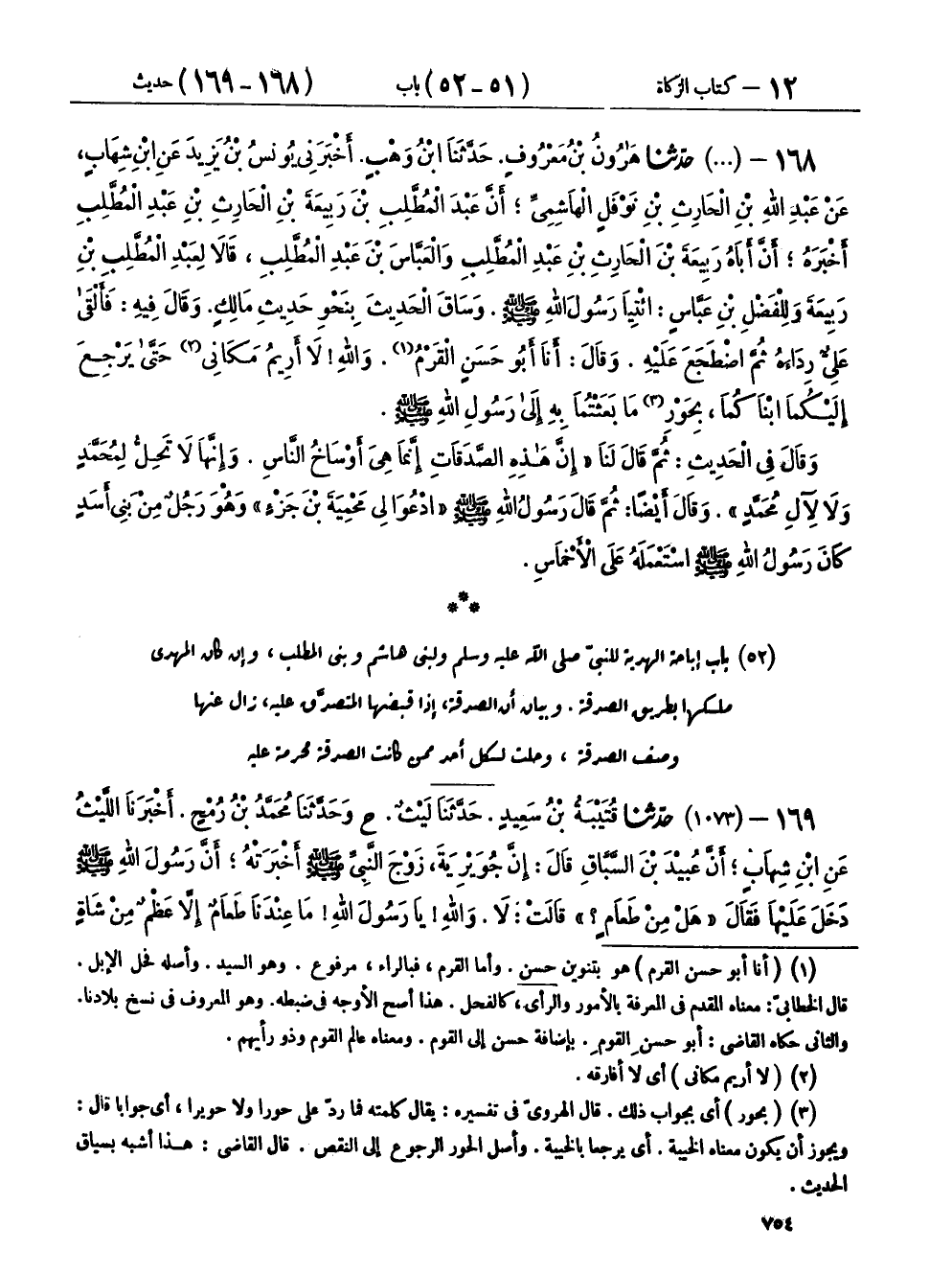 ١٦٧ - (١٠٧٢) حَدَّثَنَا هَارُونُ بْنُ مَعْرُوفٍ، حَدَّثَنَا ابْنُ وَهْبٍ، أَخْبَرَنِي يُونُسُ بْنُ يَزِيدَ، عَنِ ابْنِ شِهَابٍ، عَنْ عَبْدِ اللهِ بْنِ الْحَارِثِ بْنِ نَوْفَلٍ الْهَاشِمِيِّ، أَنَّ عَبْدَ الْمُطَّلِبِ بْنَ رَبِيعَةَ بْنِ الْحَارِثِ بْنِ عَبْدِ الْمُطَّلِبِ، أَخْبَرَهُ أَنَّ أَبَاهُ رَبِيعَةَ بْنَ الْحَارِثِ بْنِ عَبْدِ الْمُطَّلِبِ، وَالْعَبَّاسَ بْنَ عَبْدِ الْمُطَّلِبِ قَالَا: لِعَبْدِ الْمُطَّلِبِ بْنِ رَبِيعَةَ، وَلِلْفَضْلِ بْنِ عَبَّاسٍ، ائْتِيَا رَسُولَ اللهِ صَلَّى اللهُ عَلَيْهِ وَسَلَّمَ وَسَاقَ الْحَدِيثَ بِنَحْوِ حَدِيثِ مَالِكٍ، وَقَالَ فِيهِ: فَأَلْقَى عَلِيٌّ رِدَاءَهُ، ثُمَّ اضْطَجَعَ عَلَيْهِ، وَقَالَ: أَنَا أَبُو حَسَنٍ الْقَرْمُ، وَاللهِ، لَا أَرِيمُ مَكَانِي حَتَّى يَرْجِعَ إِلَيْكُمَا ابْنَاكُمَا، بِحَوْرِ مَا بَعَثْتُمَا بِهِ إِلَى رَسُولِ اللهِ صَلَّى اللهُ عَلَيْهِ وَسَلَّمَ. وَقَالَ فِي الْحَدِيثِ: ثُمَّ قَالَ لَنَا «إِنَّ هَذِهِ الصَّدَقَاتِ إِنَّمَا هِيَ أَوْسَاخُ النَّاسِ، وَإِنَّهَا لَا تَحِلُّ لِمُحَمَّدٍ، وَلَا لِآلِ مُحَمَّدٍ» وَقَالَ أَيْضًا: ثُمَّ قَالَ رَسُولُ اللهِ صَلَّى اللهُ عَلَيْهِ وَسَلَّمَ «ادْعُوَا لِي مَحْمِيَةَ بْنَ جَزْءٍ»، وَهُوَ رَجُلٌ مِنْ بَنِي أَسَدٍ كَانَ رَسُولُ اللهِ صَلَّى اللهُ عَلَيْهِ وَسَلَّمَ اسْتَعْمَلَهُ عَلَى الْأَخْمَاسِ