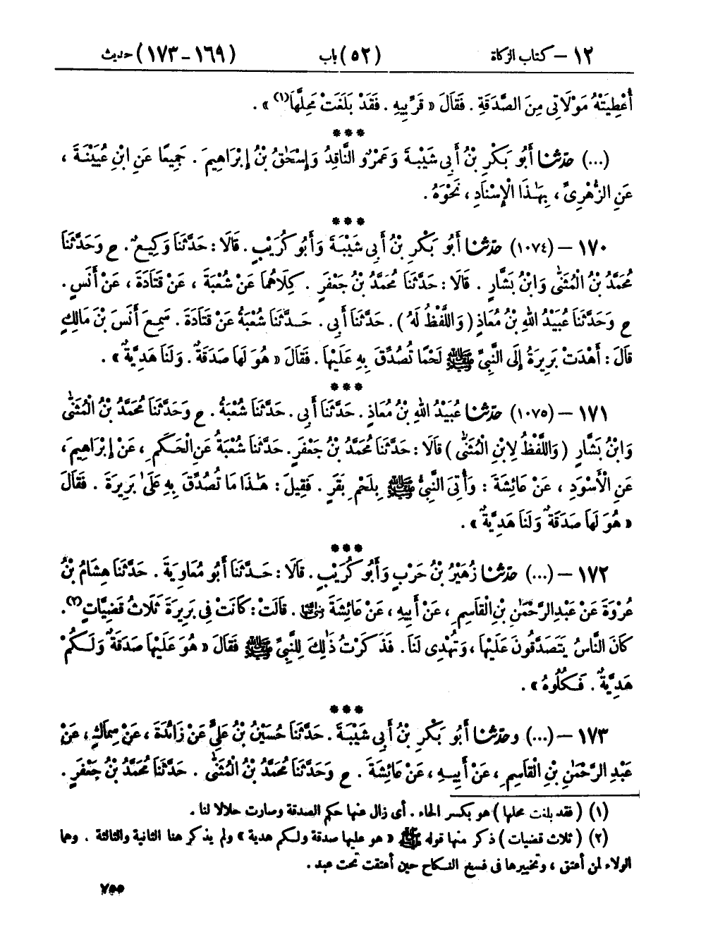 ١٧٢ - (١٠٧٥) حَدَّثَنَا زُهَيْرُ بْنُ حَرْبٍ، وَأَبُو كُرَيْبٍ، قَالَا: حَدَّثَنَا أَبُو مُعَاوِيَةَ، حَدَّثَنَا هِشَامُ بْنُ عُرْوَةَ، عَنْ عَبْدِ الرَّحْمَنِ بْنِ الْقَاسِمِ، عَنْ أَبِيهِ، عَنْ عَائِشَةَ رَضِيَ اللهُ عَنْهَا، قَالَتْ: كَانَتْ فِي بَرِيرَةَ ثَلَاثُ قَضِيَّاتٍ كَانَ النَّاسُ يَتَصَدَّقُونَ عَلَيْهَا، وَتُهْدِي لَنَا، فَذَكَرْتُ ذَلِكَ لِلنَّبِيِّ صَلَّى اللهُ عَلَيْهِ وَسَلَّمَ فَقَالَ: «هُوَ عَلَيْهَا صَدَقَةٌ وَلَكُمْ هَدِيَّةٌ فَكُلُوهُ»