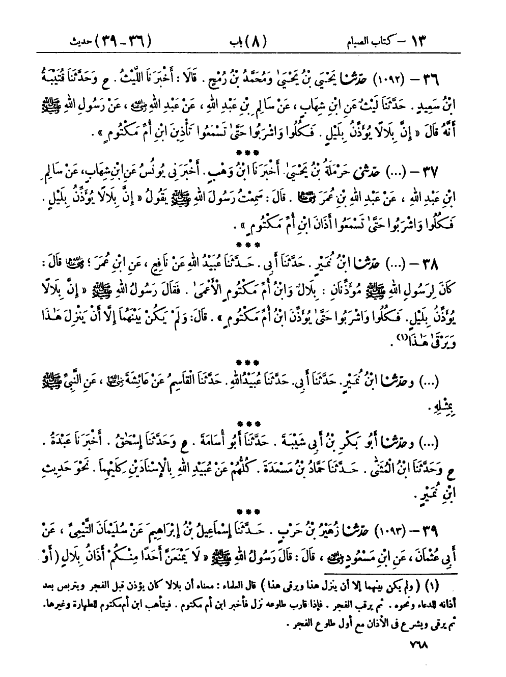 ٣٦ - (١٠٩٢) حَدَّثَنَا يَحْيَى بْنُ يَحْيَى، وَمُحَمَّدُ بْنُ رُمْحٍ، قَالَا: أَخْبَرَنَا اللَّيْثُ، ح وحَدَّثَنَا قُتَيْبَةُ بْنُ سَعِيدٍ، حَدَّثَنَا لَيْثٌ، عَنِ ابْنِ شِهَابٍ، عَنْ سَالِمِ بْنِ عَبْدِ اللهِ، عَنْ عَبْدِ اللهِ رَضِيَ اللهُ عَنْهُ، عَنْ رَسُولِ اللهِ صَلَّى اللهُ عَلَيْهِ وَسَلَّمَ، أَنَّهُ قَالَ: «إِنَّ بِلَالًا يُؤَذِّنُ بِلَيْلٍ، فَكُلُوا وَاشْرَبُوا حَتَّى تَسْمَعُوا تَأْذِينَ ابْنِ أُمِّ مَكْتُومٍ»