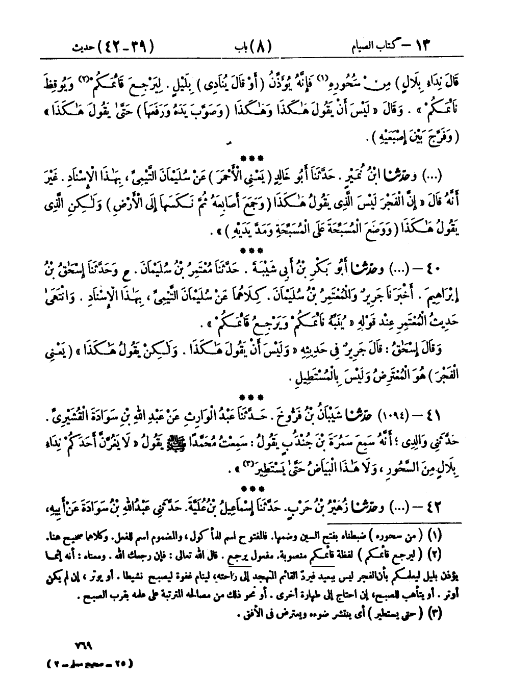 ٤٠ - (١٠٩٣) وحَدَّثَنَا أَبُو بَكْرِ بْنُ أَبِي شَيْبَةَ، حَدَّثَنَا مُعْتَمِرُ بْنُ سُلَيْمَانَ، ح وحَدَّثَنَا إِسْحَاقُ بْنُ إِبْرَاهِيمَ، أَخْبَرَنَا جَرِيرٌ، وَالْمُعْتَمِرُ بْنُ سُلَيْمَانَ، كِلَاهُمَا عَنْ سُلَيْمَانَ التَّيْمِيِّ بِهَذَا الْإِسْنَادِ، وَانْتَهَى حَدِيثُ الْمُعْتَمِرِ عِنْدَ قَوْلِهِ: «يُنَبِّهُ نَائِمَكُمْ وَيَرْجِعُ قَائِمَكُمْ» وقَالَ إِسْحَاقُ: قَالَ جَرِيرٌ فِي حَدِيثِهِ «وَلَيْسَ أَنْ يَقُولَ هَكَذَا، وَلَكِنْ يَقُولُ هَكَذَا» - يَعْنِي الْفَجْرَ - هُوَ الْمُعْتَرِضُ وَلَيْسَ بِالْمُسْتَطِيلِ