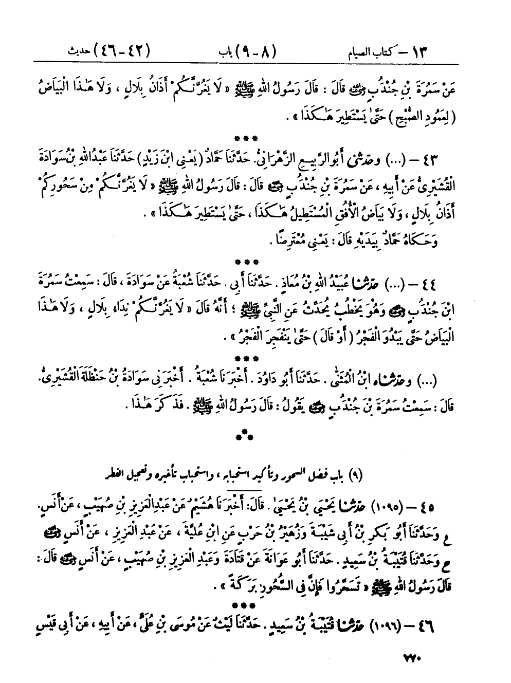 ٤٣ - (١٠٩٤) وحَدَّثَنِي أَبُو الرَّبِيعِ الزَّهْرَانِيُّ، حَدَّثَنَا حَمَّادٌ يَعْنِي ابْنَ زَيْدٍ، حَدَّثَنَا عَبْدُ اللهِ بْنُ سَوَادَةَ الْقُشَيْرِيُّ، عَنْ أَبِيهِ، عَنْ سَمُرَةَ بْنِ جُنْدُبٍ رَضِيَ اللهُ عَنْهُ، قَالَ: قَالَ رَسُولُ اللهِ صَلَّى اللهُ عَلَيْهِ وَسَلَّمَ: «لَا يَغُرَّنَّكُمْ مِنْ سَحُورِكُمْ أَذَانُ بِلَالٍ، وَلَا بَيَاضُ الْأُفُقِ الْمُسْتَطِيلُ هَكَذَا، حَتَّى يَسْتَطِيرَ هَكَذَا» وَحَكَاهُ حَمَّادٌ بِيَدَيْهِ، قَالَ: يَعْنِي مُعْتَرِضًا