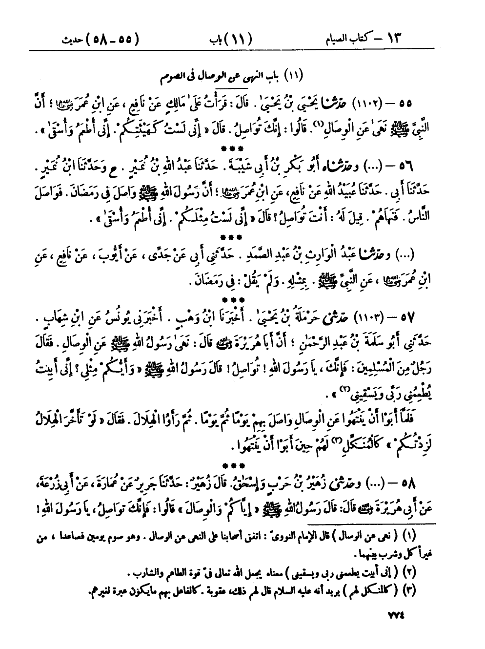 ٥٧ - (١١٠٣) حَدَّثَنِي حَرْمَلَةُ بْنُ يَحْيَى، أَخْبَرَنَا ابْنُ وَهْبٍ، أَخْبَرَنِي يُونُسُ، عَنِ ابْنِ شِهَابٍ، حَدَّثَنِي أَبُو سَلَمَةَ بْنُ عَبْدِ الرَّحْمَنِ، أَنَّ أَبَا هُرَيْرَةَ رَضِيَ اللهُ عَنْهُ، قَالَ: نَهَى رَسُولُ اللهِ صَلَّى اللهُ عَلَيْهِ وَسَلَّمَ عَنِ الْوِصَالِ، فَقَالَ رَجُلٌ مِنَ الْمُسْلِمِينَ: فَإِنَّكَ يَا رَسُولَ اللهِ تُوَاصِلُ، قَالَ رَسُولُ اللهِ صَلَّى اللهُ عَلَيْهِ وَسَلَّمَ: «وَأَيُّكُمْ مِثْلِي؟ إِنِّي أَبِيتُ يُطْعِمُنِي رَبِّي وَيَسْقِينِي» فَلَمَّا أَبَوْا أَنْ يَنْتَهُوا عَنِ الْوِصَالِ وَاصَلَ بِهِمْ يَوْمًا، ثُمَّ يَوْمًا، ثُمَّ رَأَوُا الْهِلَالَ، فَقَالَ: «لَوْ تَأَخَّرَ الْهِلَالُ لَزِدْتُكُمْ» كَالْمُنَكِّلِ لَهُمْ حِينَ أَبَوْا أَنْ يَنْتَهُوا