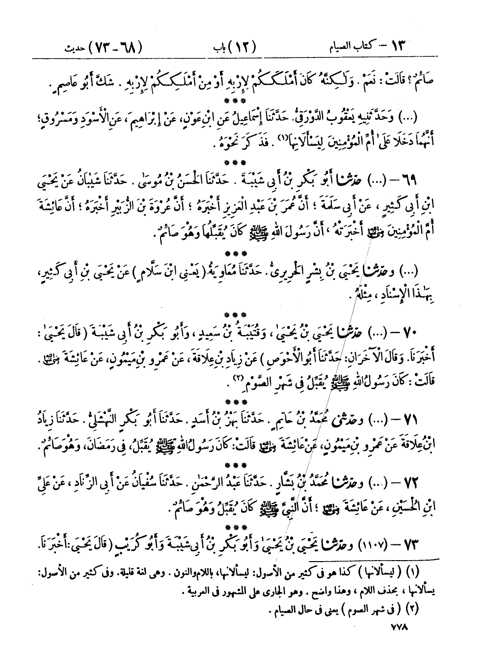 ٧٢ - (١١٠٦) وحَدَّثَنَا مُحَمَّدُ بْنُ بَشَّارٍ، حَدَّثَنَا عَبْدُ الرَّحْمَنِ، حَدَّثَنَا سُفْيَانُ، عَنْ أَبِي الزِّنَادِ، عَنْ عَلِيِّ بْنِ الْحُسَيْنِ، عَنْ عَائِشَةَ رَضِيَ اللهُ عَنْهَا: «أَنَّ النَّبِيَّ صَلَّى اللهُ عَلَيْهِ وَسَلَّمَ كَانَ يُقَبِّلُ وَهُوَ صَائِمٌ»