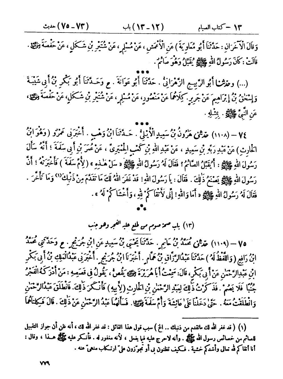 ٧٥ - (١١٠٩) حَدَّثَنِي مُحَمَّدُ بْنُ حَاتِمٍ، حَدَّثَنَا يَحْيَى بْنُ سَعِيدٍ، عَنِ ابْنِ جُرَيْجٍ، ح وحَدَّثَنِي مُحَمَّدُ بْنُ رَافِعٍ، - وَاللَّفْظُ لَهُ - حَدَّثَنَا عَبْدُ الرَّزَّاقِ بْنُ هَمَّامٍ، أَخْبَرَنَا ابْنُ جُرَيْجٍ، أَخْبَرَنِي عَبْدُ الْمَلِكِ بْنُ أَبِي بَكْرِ بْنِ عَبْدِ الرَّحْمَنِ، عَنْ أَبِي بَكْرٍ، قَالَ: سَمِعْتُ أَبَا هُرَيْرَةَ رَضِيَ اللهُ عَنْهُ، يَقُصُّ، يَقُولُ فِي قَصَصِهِ: «مَنْ أَدْرَكَهُ الْفَجْرُ جُنُبًا فَلَا يَصُمْ»، فَذَكَرْتُ ذَلِكَ لِعَبْدِ الرَّحْمَنِ بْنِ الْحَارِثِ - لِأَبِيهِ - فَأَنْكَرَ ذَلِكَ، فَانْطَلَقَ عَبْدُ الرَّحْمَنِ وَانْطَلَقْتُ مَعَهُ، حَتَّى دَخَلْنَا عَلَى عَائِشَةَ وَأُمِّ سَلَمَةَ رَضِيَ اللهُ عَنْهُمَا، فَسَأَلَهُمَا عَبْدُ الرَّحْمَنِ عَنْ ذَلِكَ، قَالَ: فَكِلْتَاهُمَا قَالَتْ: «كَانَ النَّبِيُّ صَلَّى اللهُ عَلَيْهِ وَسَلَّمَ يُصْبِحُ جُنُبًا مِنْ غَيْرِ حُلُمٍ، ثُمَّ يَصُومُ» قَالَ: فَانْطَلَقْنَا حَتَّى دَخَلْنَا عَلَى مَرْوَانَ، فَذَكَرَ ذَلِكَ لَهُ عَبْدُ الرَّحْمَنِ، فَقَالَ مَرْوَانُ: عَزَمْتُ عَلَيْكَ إِلَّا مَا ذَهَبْتَ إِلَى أَبِي هُرَيْرَةَ، فَرَدَدْتَ عَلَيْهِ مَا يَقُولُ: قَالَ: فَجِئْنَا أَبَا هُرَيْرَةَ، وَأَبُو بَكْرٍ حَاضِرُ ذَلِكَ كُلِّهِ، قَالَ: فَذَكَرَ لَهُ عَبْدُ الرَّحْمَنِ، فَقَالَ أَبُو هُرَيْرَةَ: أَهُمَا قَالَتَاهُ لَكَ؟ قَالَ: نَعَمْ، قَالَ: هُمَا أَعْلَمُ، ثُمَّ رَدَّ أَبُو هُرَيْرَةَ مَا كَانَ يَقُولُ فِي ذَلِكَ إِلَى الْفَضْلِ بْنِ الْعَبَّاسِ، فَقَالَ أَبُو هُرَيْرَةَ: سَمِعْتُ ذَلِكَ مِنَ الْفَضْلِ، وَلَمْ أَسْمَعْهُ مِنَ النَّبِيِّ صَلَّى اللهُ عَلَيْهِ وَسَلَّمَ، قَالَ: فَرَجَعَ أَبُو هُرَيْرَةَ عَمَّا كَانَ يَقُولُ فِي ذَلِكَ، قُلْتُ لِعَبْدِ الْمَلِكِ: أَقَالَتَا: فِي رَمَضَانَ؟ قَالَ: كَذَلِكَ كَانَ يُصْبِحُ جُنُبًا مِنْ غَيْرِ حُلُمٍ ثُمَّ يَصُومُ
