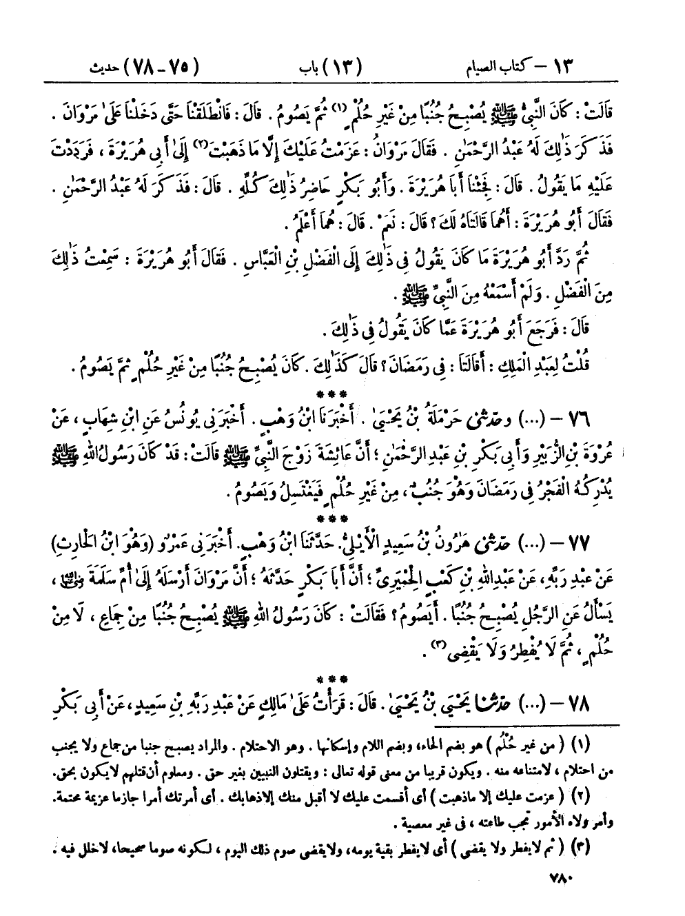 ٧٧ - (١١٠٩) حَدَّثَنِي هَارُونُ بْنُ سَعِيدٍ الْأَيْلِيُّ، حَدَّثَنَا ابْنُ وَهْبٍ، أَخْبَرَنِي عَمْرٌو، وَهُوَ ابْنُ الْحَارِثِ، عَنْ عَبْدِ رَبِّهِ، عَنْ عَبْدِ اللهِ بْنِ كَعْبٍ الْحِمْيَرِيِّ، أَنَّ أَبَا بَكْرٍ، حَدَّثَهُ أَنَّ مَرْوَانَ أَرْسَلَهُ إِلَى أُمِّ سَلَمَةَ رَضِيَ اللهُ عَنْهَا يَسْأَلُ عَنِ الرَّجُلِ يُصْبِحُ جُنُبًا، أَيَصُومُ؟ فَقَالَتْ: «كَانَ رَسُولُ اللهِ صَلَّى اللهُ عَلَيْهِ وَسَلَّمَ يُصْبِحُ جُنُبًا مِنْ جِمَاعٍ، لَا مِنْ حُلُمٍ، ثُمَّ لَا يُفْطِرُ وَلَا يَقْضِي»