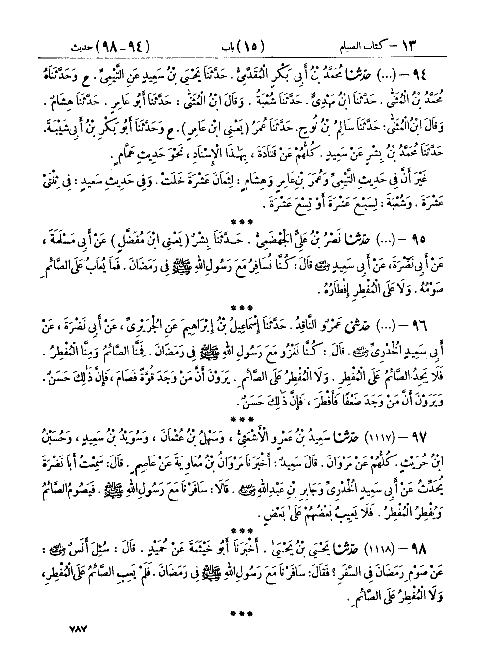 ٩٥ - (١١١٦) حَدَّثَنَا نَصْرُ بْنُ عَلِيٍّ الْجَهْضَمِيُّ، حَدَّثَنَا بِشْرٌ يَعْنِي ابْنَ مُفَضَّلٍ، عَنْ أَبِي مَسْلَمَةَ، عَنْ أَبِي نَضْرَةَ، عَنْ أَبِي سَعِيدٍ رَضِيَ اللهُ عَنْهُ، قَالَ: «كُنَّا نُسَافِرُ مَعَ رَسُولِ اللهِ صَلَّى اللهُ عَلَيْهِ وَسَلَّمَ فِي رَمَضَانَ، فَمَا يُعَابُ عَلَى الصَّائِمِ صَوْمُهُ، وَلَا عَلَى الْمُفْطِرِ إِفْطَارُهُ»