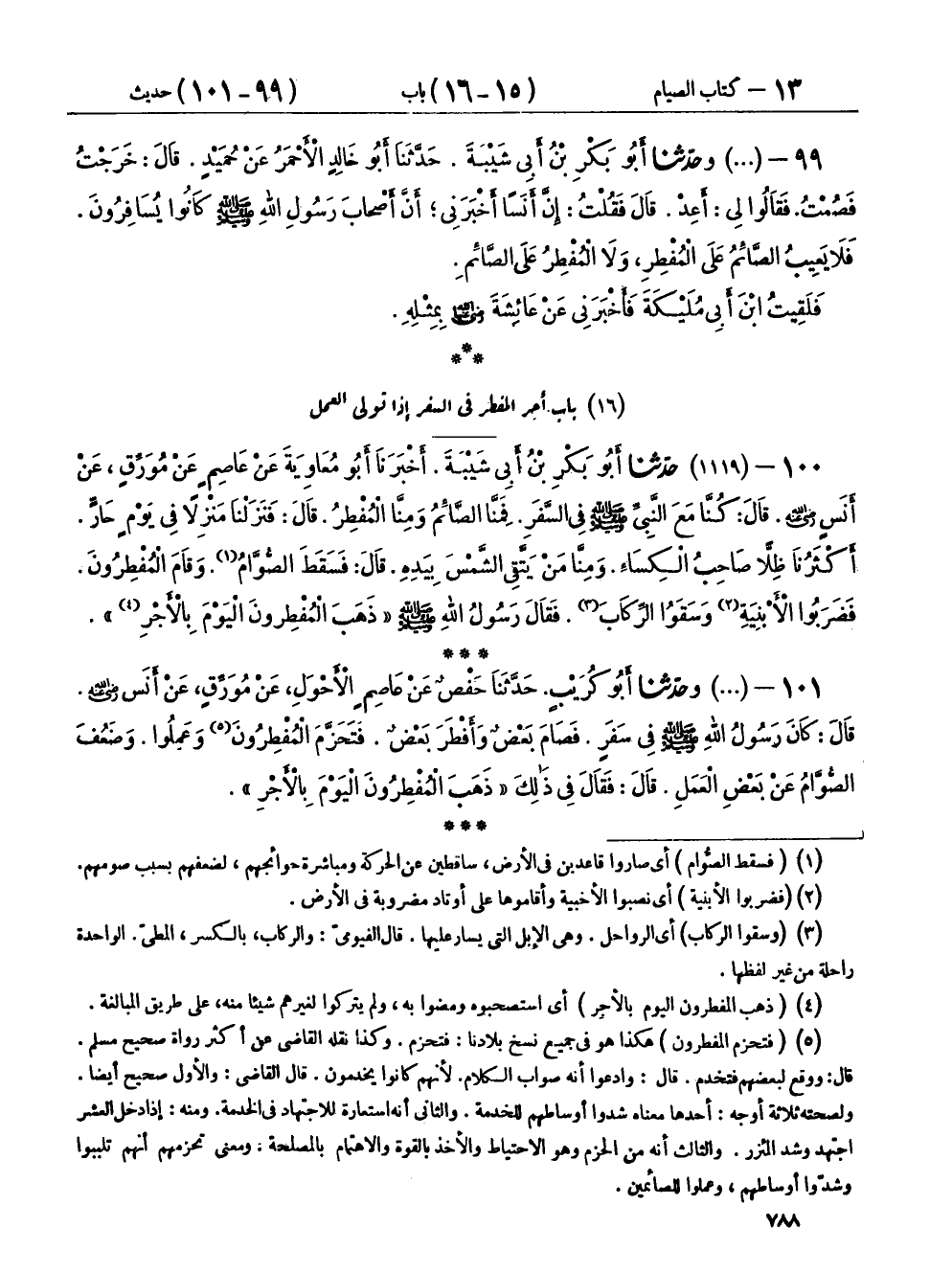 ١٠٠ - (١١١٩) حَدَّثَنَا أَبُو بَكْرِ بْنُ أَبِي شَيْبَةَ، أَخْبَرَنَا أَبُو مُعَاوِيَةَ، عَنْ عَاصِمٍ، عَنْ مُوَرِّقٍ، عَنْ أَنَسٍ رَضِيَ اللهُ عَنْهُ، قَالَ: كُنَّا مَعَ النَّبِيِّ صَلَّى اللهُ عَلَيْهِ وَسَلَّمَ فِي السَّفَرِ، فَمِنَّا الصَّائِمُ وَمِنَّا الْمُفْطِرُ، قَالَ: فَنَزَلْنَا مَنْزِلًا فِي يَوْمٍ حَارٍّ، أَكْثَرُنَا ظِلًّا صَاحِبُ الْكِسَاءِ، وَمِنَّا مَنْ يَتَّقِي الشَّمْسَ بِيَدِهِ، قَالَ: فَسَقَطَ الصُّوَّامُ، وَقَامَ الْمُفْطِرُونَ، فَضَرَبُوا الْأَبْنِيَةِ وَسَقَوْا الرِّكَابَ، فَقَالَ رَسُولُ اللهِ صَلَّى اللهُ عَلَيْهِ وَسَلَّمَ: «ذَهَبَ الْمُفْطِرُونَ الْيَوْمَ بِالْأَجْرِ»