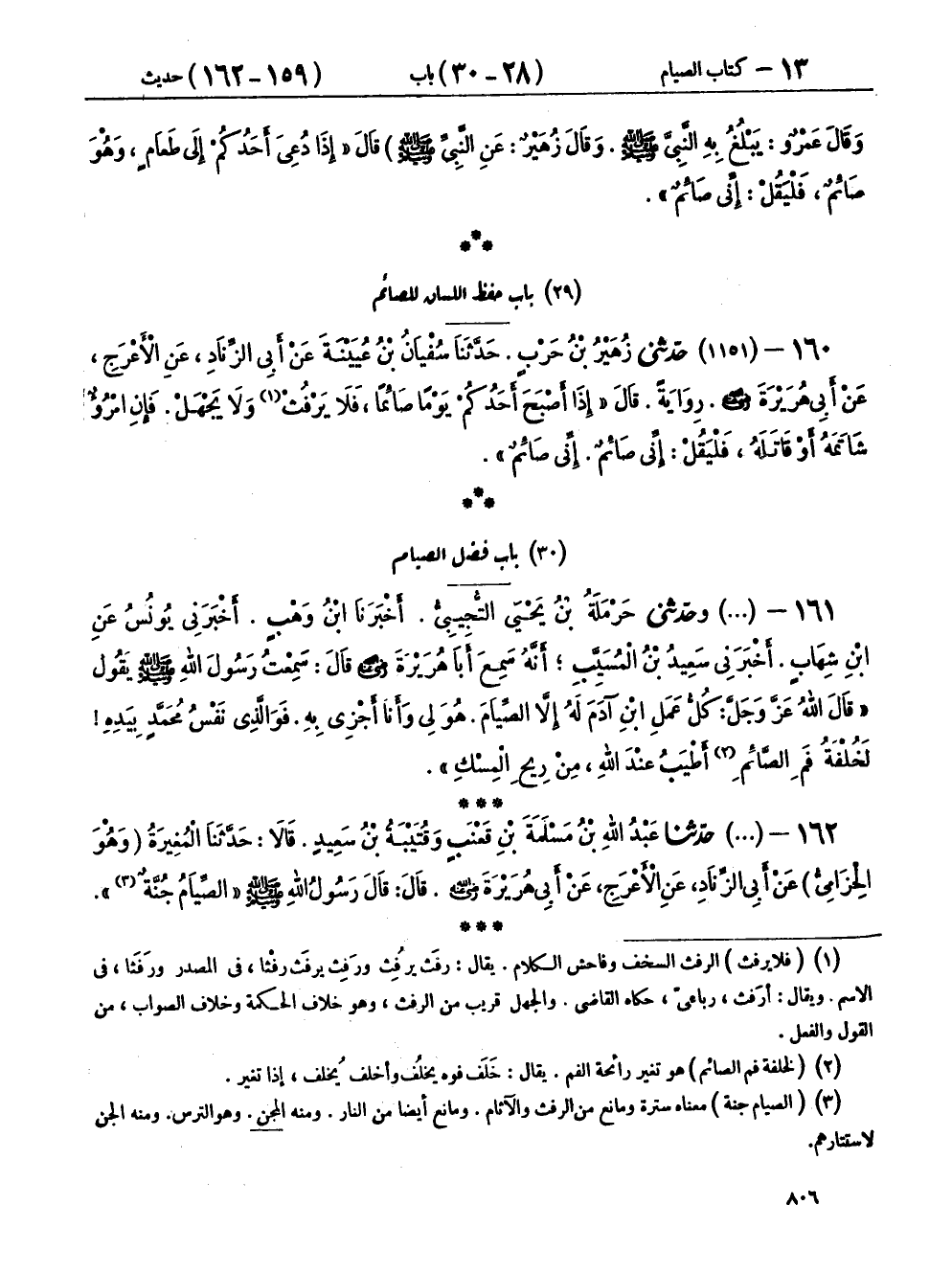 ١٦٢ - (١١٥١) حَدَّثَنَا عَبْدُ اللهِ بْنُ مَسْلَمَةَ بْنِ قَعْنَبٍ، وَقُتَيْبَةُ بْنُ سَعِيدٍ، قَالَا: حَدَّثَنَا الْمُغِيرَةُ وَهُوَ الْحِزَامِيُّ، عَنْ أَبِي الزِّنَادِ، عَنِ الْأَعْرَجِ، عَنْ أَبِي هُرَيْرَةَ رَضِيَ اللهُ عَنْهُ، قَالَ: قَالَ رَسُولُ اللهِ صَلَّى اللهُ عَلَيْهِ وَسَلَّمَ: «الصِّيَامُ جُنَّةٌ»