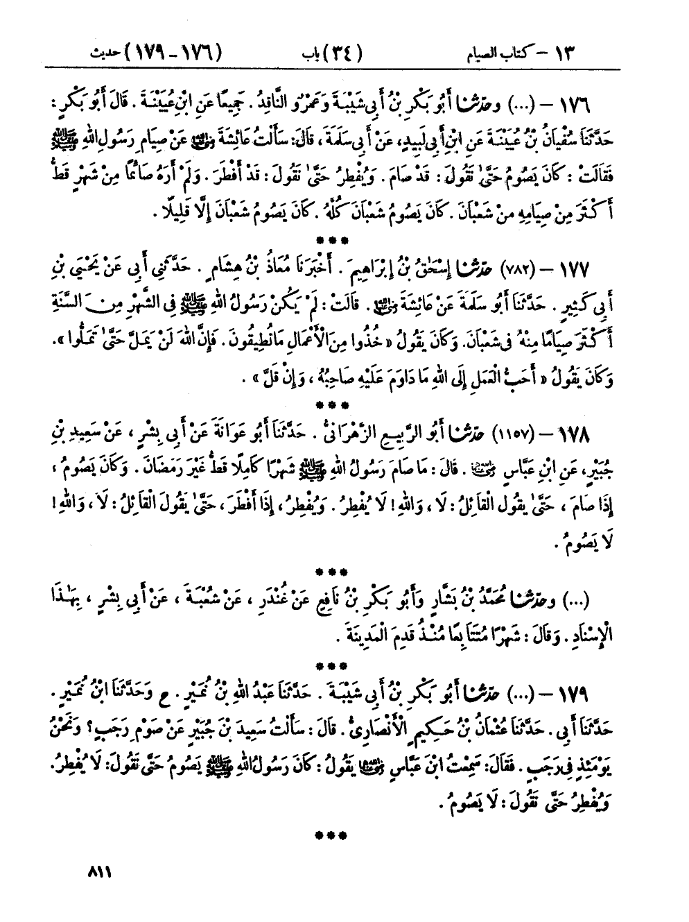 ١٧٦ - (١١٥٦) وحَدَّثَنَا أَبُو بَكْرِ بْنُ أَبِي شَيْبَةَ، وَعَمْرٌو النَّاقِدُ، جَمِيعًا عَنِ ابْنِ عُيَيْنَةَ، قَالَ أَبُو بَكْرٍ: حَدَّثَنَا سُفْيَانُ بْنُ عُيَيْنَةَ، عَنِ ابْنِ أَبِي لَبِيدٍ، عَنْ أَبِي سَلَمَةَ، قَالَ: سَأَلْتُ عَائِشَةَ رَضِيَ اللهُ عَنْهَا، عَنْ صِيَامِ رَسُولِ اللهِ صَلَّى اللهُ عَلَيْهِ وَسَلَّمَ، فَقَالَتْ: " كَانَ يَصُومُ حَتَّى نَقُولَ: قَدْ صَامَ وَيُفْطِرُ حَتَّى نَقُولَ: قَدْ أَفْطَرَ، وَلَمْ أَرَهُ صَائِمًا مِنْ شَهْرٍ قَطُّ، أَكْثَرَ مِنْ صِيَامِهِ مِنْ شَعْبَانَ كَانَ يَصُومُ شَعْبَانَ كُلَّهُ، كَانَ يَصُومُ شَعْبَانَ إِلَّا قَلِيلًا "