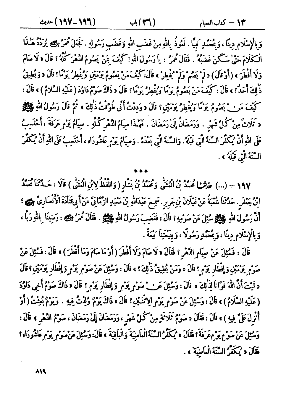 ١٩٧ - (١١٦٢) حَدَّثَنَا مُحَمَّدُ بْنُ الْمُثَنَّى، وَمُحَمَّدُ بْنُ بَشَّارٍ، - وَاللَّفْظُ لِابْنِ الْمُثَنَّى - قَالَا: حَدَّثَنَا مُحَمَّدُ بْنُ جَعْفَرٍ، حَدَّثَنَا شُعْبَةُ، عَنْ غَيْلَانَ بْنِ جَرِيرٍ، سَمِعَ عَبْدَ اللهِ بْنَ مَعْبَدٍ الزِّمَّانِيَّ، عَنْ أَبِي قَتَادَةَ الْأَنْصَارِيِّ رَضِيَ اللهُ عَنْهُ، أَنَّ رَسُولَ اللهِ صَلَّى اللهُ عَلَيْهِ وَسَلَّمَ سُئِلَ عَنْ صَوْمِهِ؟ قَالَ: فَغَضِبَ رَسُولُ اللهِ صَلَّى اللهُ عَلَيْهِ وَسَلَّمَ، فَقَالَ عُمَرُ رَضِيَ اللهُ عَنْهُ: رَضِينَا بِاللهِ رَبًّا، وَبِالْإِسْلَامِ دِينًا، وَبِمُحَمَّدٍ رَسُولًا، وَبِبَيْعَتِنَا بَيْعَةً. قَالَ: فَسُئِلَ عَنْ صِيَامِ الدَّهْرِ؟ فَقَالَ: «لَا صَامَ وَلَا أَفْطَرَ - أَوْ مَا صَامَ وَمَا أَفْطَرَ -» قَالَ: فَسُئِلَ عَنْ صَوْمِ يَوْمَيْنِ وَإِفْطَارِ يَوْمٍ؟ قَالَ: «وَمَنْ يُطِيقُ ذَلِكَ؟» قَالَ: وَسُئِلَ عَنْ صَوْمِ يَوْمٍ، وَإِفْطَارِ يَوْمَيْنِ؟ قَالَ: «لَيْتَ أَنَّ اللهَ قَوَّانَا لِذَلِكَ» قَالَ: وَسُئِلَ عَنْ صَوْمِ يَوْمٍ، وَإِفْطَارِ يَوْمٍ؟ قَالَ: «ذَاكَ صَوْمُ أَخِي دَاوُدَ - عَلَيْهِ السَّلَام -» قَالَ: وَسُئِلَ عَنْ صَوْمِ يَوْمِ الِاثْنَيْنِ؟ قَالَ: «ذَاكَ يَوْمٌ وُلِدْتُ فِيهِ، وَيَوْمٌ بُعِثْتُ - أَوْ أُنْزِلَ عَلَيَّ فِيهِ -» قَالَ: فَقَالَ: «صَوْمُ ثَلَاثَةٍ مِنْ كُلِّ شَهْرٍ، وَرَمَضَانَ إِلَى رَمَضَانَ، صَوْمُ الدَّهْرِ» قَالَ: وَسُئِلَ عَنْ صَوْمِ يَوْمِ عَرَفَةَ؟ فَقَالَ: «يُكَفِّرُ السَّنَةَ الْمَاضِيَةَ وَالْبَاقِيَةَ» قَالَ: وَسُئِلَ عَنْ صَوْمِ يَوْمِ عَاشُورَاءَ؟ فَقَالَ: «يُكَفِّرُ السَّنَةَ الْمَاضِيَةَ» وَفِي هَذَا الْحَدِيثِ مِنْ رِوَايَةِ شُعْبَةَ قَالَ: وَسُئِلَ عَنْ صَوْمِ يَوْمِ الِاثْنَيْنِ وَالْخَمِيسِ؟ فَسَكَتْنَا عَنْ ذِكْرِ الْخَمِيسِ لَمَّا نُرَاهُ وَهْمًا