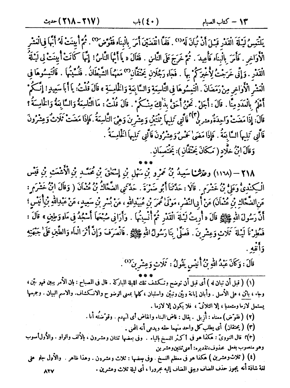 ٢١٨ - (١١٦٨) وحَدَّثَنَا سَعِيدُ بْنُ عَمْرِو بْنِ سَهْلِ بْنِ إِسْحَاقَ بْنِ مُحَمَّدِ بْنِ الْأَشْعَثِ بْنِ قَيْسٍ الْكِنْدِيُّ، وَعَلِيُّ بْنُ خَشْرَمٍ، قَالَا: حَدَّثَنَا أَبُو ضَمْرَةَ، حَدَّثَنِي الضَّحَّاكُ بْنُ عُثْمَانَ - وَقَالَ ابْنُ خَشْرَمٍ: عَنِ الضَّحَّاكِ بْنِ عُثْمَانَ - عَنْ أَبِي النَّضْرِ، مَوْلَى عُمَرَ بْنِ عُبَيْدِ اللهِ، عَنْ بُسْرِ بْنِ سَعِيدٍ، عَنْ عَبْدِ اللهِ بْنِ أُنَيْسٍ، أَنَّ رَسُولَ اللهِ صَلَّى اللهُ عَلَيْهِ وَسَلَّمَ، قَالَ: «أُرِيتُ لَيْلَةَ الْقَدْرِ، ثُمَّ أُنْسِيتُهَا، وَأَرَانِي صُبْحَهَا أَسْجُدُ فِي مَاءٍ وَطِينٍ» قَالَ: فَمُطِرْنَا لَيْلَةَ ثَلَاثٍ وَعِشْرِينَ، فَصَلَّى بِنَا رَسُولُ اللهِ صَلَّى اللهُ عَلَيْهِ وَسَلَّمَ، فَانْصَرَفَ وَإِنَّ أَثَرَ الْمَاءِ وَالطِّينِ عَلَى جَبْهَتِهِ وَأَنْفِهِ قَالَ: وَكَانَ عَبْدُ اللهِ بْنُ أُنَيْسٍ يَقُولُ: ثَلَاثٍ وَعِشْرِينَ
