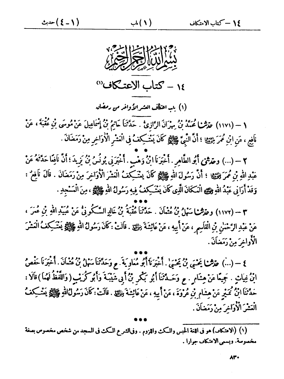 ١ - (١١٧١) حَدَّثَنَا مُحَمَّدُ بْنُ مِهْرَانَ الرَّازِيُّ، حَدَّثَنَا حَاتِمُ بْنُ إِسْمَاعِيلَ، عَنْ مُوسَى بْنِ عُقْبَةَ، عَنْ نَافِعٍ، عَنِ ابْنِ عُمَرَ رَضِيَ اللهُ عَنْهُمَا: «أَنَّ النَّبِيَّ صَلَّى اللهُ عَلَيْهِ وَسَلَّمَ كَانَ يَعْتَكِفُ فِي الْعَشْرِ الْأَوَاخِرِ مِنْ رَمَضَانَ»