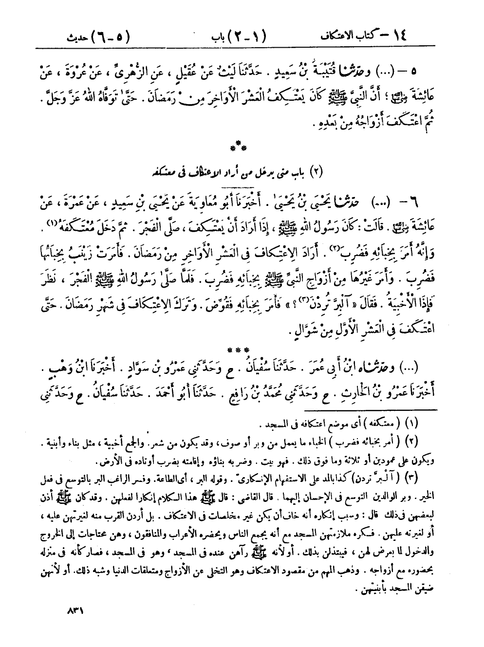 ٦ - (١١٧٢) حَدَّثَنَا يَحْيَى بْنُ يَحْيَى، أَخْبَرَنَا أَبُو مُعَاوِيَةَ، عَنْ يَحْيَى بْنِ سَعِيدٍ، عَنْ عَمْرَةَ، عَنْ عَائِشَةَ رَضِيَ اللهُ عَنْهَا، قَالَتْ: كَانَ رَسُولُ اللهِ صَلَّى اللهُ عَلَيْهِ وَسَلَّمَ، إِذَا أَرَادَ أَنْ يَعْتَكِفَ صَلَّى الْفَجْرَ، ثُمَّ دَخَلَ مُعْتَكَفَهُ وَإِنَّهُ أَمَرَ بِخِبَائِهِ فَضُرِبَ، أَرَادَ الِاعْتِكَافَ فِي الْعَشْرِ الْأَوَاخِرِ مِنْ رَمَضَانَ، فَأَمَرَتْ زَيْنَبُ بِخِبَائِهَا فَضُرِبَ، وَأَمَرَ غَيْرُهَا مِنْ أَزْوَاجِ النَّبِيِّ صَلَّى اللهُ عَلَيْهِ وَسَلَّمَ بِخِبَائِهِ فَضُرِبَ، فَلَمَّا صَلَّى رَسُولُ اللهِ صَلَّى اللهُ عَلَيْهِ وَسَلَّمَ الْفَجْرَ، نَظَرَ، فَإِذَا الْأَخْبِيَةُ فَقَالَ: «آلْبِرَّ تُرِدْنَ؟» فَأَمَرَ بِخِبَائِهِ فَقُوِّضَ، وَتَرَكَ الِاعْتِكَافَ فِي شَهْرِ رَمَضَانَ، حَتَّى اعْتَكَفَ فِي الْعَشْرِ الْأَوَّلِ مِنْ شَوَّالٍ