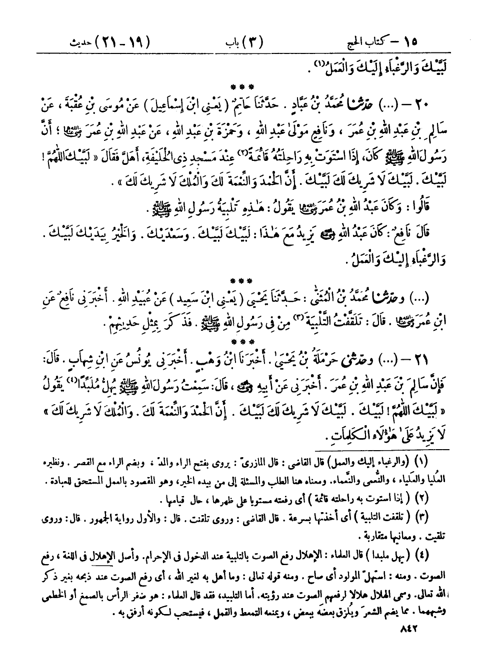 ٢٠ - (١١٨٤) حَدَّثَنَا مُحَمَّدُ بْنُ عَبَّادٍ، حَدَّثَنَا حَاتِمٌ يَعْنِي ابْنَ إِسْمَاعِيلَ، عَنْ مُوسَى بْنِ عُقْبَةَ، عَنْ سَالِمِ بْنِ عَبْدِ اللهِ بْنِ عُمَرَ، وَنَافِعٍ، مَوْلَى عَبْدِ اللهِ، وَحَمْزَةَ بْنِ عَبْدِ اللهِ، عَنْ عَبْدِ اللهِ بْنِ عُمَرَ رَضِيَ اللهُ عَنْهُمَا، أَنَّ رَسُولَ اللهِ صَلَّى اللهُ عَلَيْهِ وَسَلَّمَ كَانَ، إِذَا اسْتَوَتْ بِهِ رَاحِلَتُهُ قَائِمَةً عِنْدَ مَسْجِدِ ذِي الْحُلَيْفَةِ، أَهَلَّ فَقَالَ: «لَبَّيْكَ اللهُمَّ، لَبَّيْكَ، لَبَّيْكَ لَا شَرِيكَ لَكَ لَبَّيْكَ، إِنَّ الْحَمْدَ، وَالنِّعْمَةَ، لَكَ وَالْمُلْكَ، لَا شَرِيكَ لَكَ» قَالُوا: وَكَانَ عَبْدُ اللهِ بْنُ عُمَرَ رَضِيَ اللهُ عَنْهُمَا، يَقُولُ: هَذِهِ تَلْبِيَةُ رَسُولِ اللهِ صَلَّى اللهُ عَلَيْهِ وَسَلَّمَ قَالَ نَافِعٌ: كَانَ عَبْدُ اللهِ رَضِيَ اللهُ عَنْهُ يَزِيدُ مَعَ هَذَا: «لَبَّيْكَ لَبَّيْكَ، وَسَعْدَيْكَ، وَالْخَيْرُ بِيَدَيْكَ لَبَّيْكَ، وَالرَّغْبَاءُ إِلَيْكَ وَالْعَمَلُ»