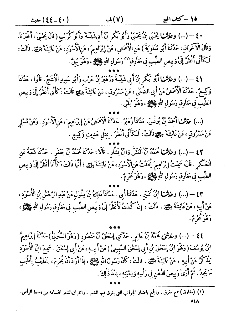 ٤٠ - (١١٩٠) وحَدَّثَنَا يَحْيَى بْنُ يَحْيَى، وَأَبُو بَكْرِ بْنُ أَبِي شَيْبَةَ وَأَبُو كُرَيْبٍ - قَالَ يَحْيَى: أَخْبَرَنَا، وقَالَ الْآخَرَانِ: - حَدَّثَنَا أَبُو مُعَاوِيَةَ، عَنِ الْأَعْمَشِ، عَنْ إِبْرَاهِيمَ، عَنِ الْأَسْوَدِ، عَنْ عَائِشَةَ رَضِيَ اللهُ عَنْهَا، قَالَتْ: «لَكَأَنِّي أَنْظُرُ إِلَى وَبِيصِ الطِّيبِ فِي مَفَارِقِ رَسُولِ اللهِ صَلَّى اللهُ عَلَيْهِ وَسَلَّمَ، وَهُوَ يُهِلُّ»