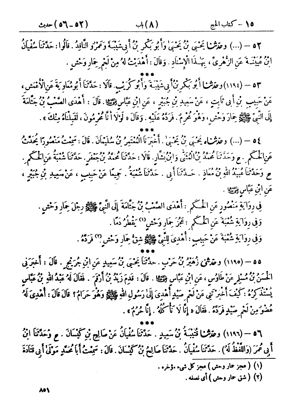 ٥٤ - (١١٩٤) وحَدَّثَنَاه يَحْيَى بْنُ يَحْيَى، أَخْبَرَنَا الْمُعْتَمِرُ بْنُ سُلَيْمَانَ، قَالَ: سَمِعْتُ مَنْصُورًا، يُحَدِّثُ عَنِ الْحَكَمِ، ح وَحَدَّثَنَا مُحَمَّدُ بْنُ الْمُثَنَّى، وَابْنُ بَشَّارٍ، قَالَا: حَدَّثَنَا مُحَمَّدُ بْنُ جَعْفَرٍ، حَدَّثَنَا شُعْبَةُ، عَنِ الْحَكَمِ، ح وحَدَّثَنَا عُبَيْدُ اللهِ بْنُ مُعَاذٍ، حَدَّثَنَا أَبِي، حَدَّثَنَا شُعْبَةُ، جَمِيعًا عَنْ حَبِيبٍ، عَنْ سَعِيدِ بْنِ جُبَيْرٍ، عَنِ ابْنِ عَبَّاسٍ رَضِيَ اللهُ عَنْهُمَا، فِي رِوَايَةِ مَنْصُورٍ، عَنِ الْحَكَمِ، أَهْدَى الصَّعْبُ بْنُ جَثَّامَةَ إِلَى النَّبِيِّ صَلَّى اللهُ عَلَيْهِ وَسَلَّمَ رِجْلَ حِمَارِ وَحْشٍ، وَفِي رِوَايَةِ شُعْبَةَ، عَنِ الْحَكَمِ، عَجُزَ حِمَارِ وَحْشٍ يَقْطُرُ دَمًا. وَفِي رِوَايَةِ شُعْبَةَ، عَنْ حَبِيبٍ، أُهْدِيَ لِلنَّبِيِّ صَلَّى اللهُ عَلَيْهِ وَسَلَّمَ شِقُّ حِمَارِ وَحْشٍ فَرَدَّهُ