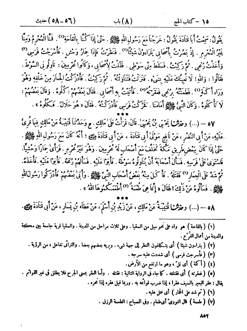 ٥٧ - (١١٩٦) وحَدَّثَنَا يَحْيَى بْنُ يَحْيَى، قَالَ: قَرَأْتُ عَلَى مَالِكٍ، ح وحَدَّثَنَا قُتَيْبَةُ، عَنْ مَالِكٍ، فِيمَا قُرِئَ عَلَيْهِ عَنْ أَبِي النَّضْرِ، عَنْ نَافِعٍ مَوْلَى أَبِي قَتَادَةَ، عَنْ أَبِي قَتَادَةَ رَضِيَ اللهُ عَنْهُ، أَنَّهُ كَانَ مَعَ رَسُولِ اللهِ صَلَّى اللهُ عَلَيْهِ وَسَلَّمَ، حَتَّى إِذَا كَانَ بِبَعْضِ طَرِيقِ مَكَّةَ تَخَلَّفَ مَعَ أَصْحَابٍ لَهُ مُحْرِمِينَ، وَهُوَ غَيْرُ مُحْرِمٍ فَرَأَى حِمَارًا وَحْشِيًّا، فَاسْتَوَى عَلَى فَرَسِهِ، فَسَأَلَ أَصْحَابَهُ أَنْ يُنَاوِلُوهُ سَوْطَهُ فَأَبَوْا عَلَيْهِ، فَسَأَلَهُمْ رُمْحَهُ فَأَبَوْا عَلَيْهِ، فَأَخَذَهُ ثُمَّ شَدَّ عَلَى الْحِمَارِ فَقَتَلَهُ، فَأَكَلَ مِنْهُ بَعْضُ أَصْحَابِ النَّبِيِّ صَلَّى اللهُ عَلَيْهِ وَسَلَّمَ وَأَبَى بَعْضُهُمْ، فَأَدْرَكُوا رَسُولَ اللهِ صَلَّى اللهُ عَلَيْهِ وَسَلَّمَ، فَسَأَلُوهُ عَنْ ذَلِكَ، فَقَالَ: «إِنَّمَا هِيَ طُعْمَةٌ أَطْعَمَكُمُوهَا اللهُ»