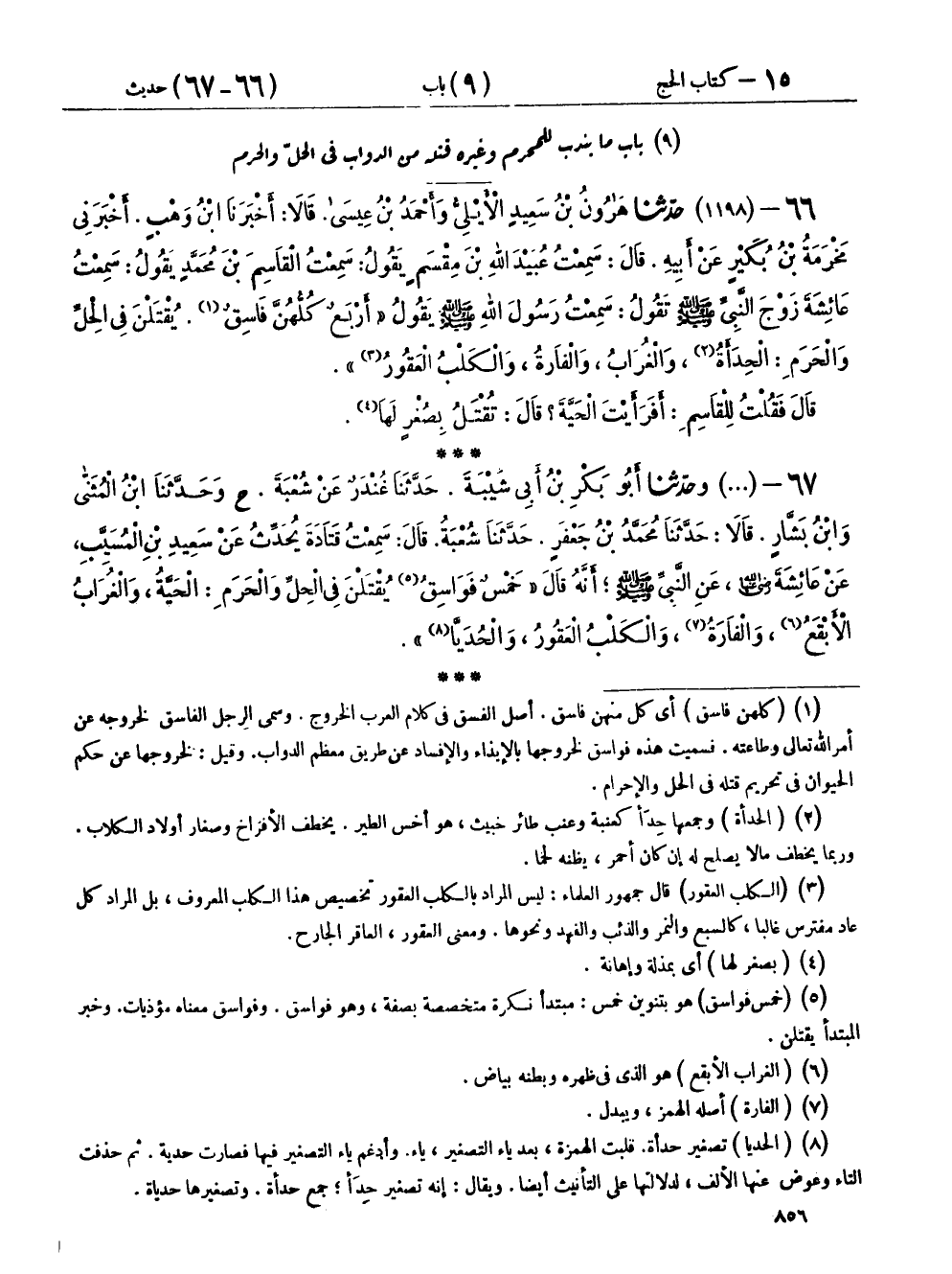 ٦٦ - (١١٩٨) حَدَّثَنَا هَارُونُ بْنُ سَعِيدٍ الْأَيْلِيُّ، وَأَحْمَدُ بْنُ عِيسَى، قَالَا: أَخْبَرَنَا ابْنُ وَهْبٍ، أَخْبَرَنِي مَخْرَمَةُ بْنُ بُكَيْرٍ، عَنْ أَبِيهِ، قَالَ: سَمِعْتُ عُبَيْدَ اللهِ بْنَ مِقْسَمٍ، يَقُولُ: سَمِعْتُ الْقَاسِمَ بْنَ مُحَمَّدٍ، يَقُولُ: سَمِعْتُ عَائِشَةَ، زَوْجَ النَّبِيِّ صَلَّى اللهُ عَلَيْهِ وَسَلَّمَ تَقُولُ: سَمِعْتُ رَسُولَ اللهِ صَلَّى اللهُ عَلَيْهِ وَسَلَّمَ، يَقُولُ: " أَرْبَعٌ كُلُّهُنَّ فَاسِقٌ، يُقْتَلْنَ فِي الْحِلِّ وَالْحَرَمِ: الْحِدَأَةُ، وَالْغُرَابُ، وَالْفَأْرَةُ، وَالْكَلْبُ الْعَقُورُ " قَالَ: فَقُلْتُ لِلْقَاسِمِ: أَفَرَأَيْتَ الْحَيَّةَ؟ قَالَ: «تُقْتَلُ بِصُغْرٍ لَهَا»
