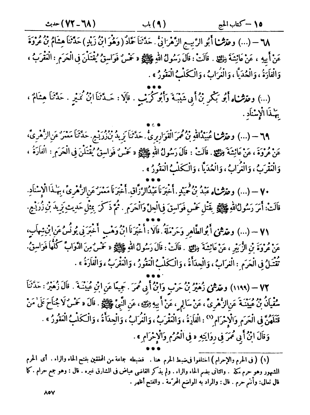 ٧٢ - (١١٩٩) وحَدَّثَنِي زُهَيْرُ بْنُ حَرْبٍ، وَابْنُ أَبِي عُمَرَ، جَمِيعًا عَنِ ابْنِ عُيَيْنَةَ، قَالَ زُهَيْرٌ: حَدَّثَنَا سُفْيَانُ بْنُ عُيَيْنَةَ، عَنِ الزُّهْرِيِّ، عَنْ سَالِمٍ، عَنْ أَبِيهِ رَضِيَ اللهُ عَنْهُ، عَنِ النَّبِيِّ صَلَّى اللهُ عَلَيْهِ وَسَلَّمَ قَالَ: " خَمْسٌ لَا جُنَاحَ عَلَى مَنْ قَتَلَهُنَّ فِي الْحَرَمِ وَالْإِحْرَامِ: الْفَأْرَةُ، وَالْعَقْرَبُ، وَالْغُرَابُ، وَالْحِدَأَةُ وَالْكَلْبُ الْعَقُورُ " وقَالَ ابْنُ أَبِي عُمَرَ فِي رِوَايَتِهِ: «فِي الْحُرُمِ وَالْإِحْرَامِ»