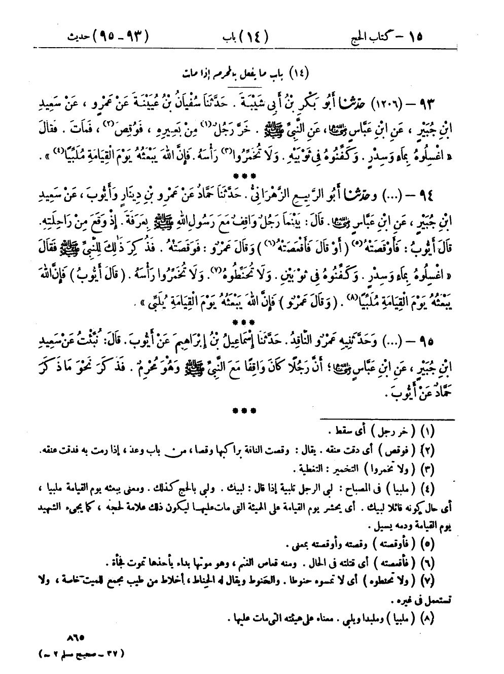 ٩٣ - (١٢٠٦) حَدَّثَنَا أَبُو بَكْرِ بْنُ أَبِي شَيْبَةَ، حَدَّثَنَا سُفْيَانُ بْنُ عُيَيْنَةَ، عَنْ عَمْرٍو، عَنْ سَعِيدِ بْنِ جُبَيْرٍ، عَنِ ابْنِ عَبَّاسٍ رَضِيَ اللهُ عَنْهُمَا، عَنِ النَّبِيِّ صَلَّى اللهُ عَلَيْهِ وَسَلَّمَ، خَرَّ رَجُلٌ مِنْ بَعِيرِهِ، فَوُقِصَ فَمَاتَ، فَقَالَ: «اغْسِلُوهُ بِمَاءٍ وَسِدْرٍ، وَكَفِّنُوهُ فِي ثَوْبَيْهِ، وَلَا تُخَمِّرُوا رَأْسَهُ، فَإِنَّ اللهَ يَبْعَثُهُ يَوْمَ الْقِيَامَةِ مُلَبِّيًا»