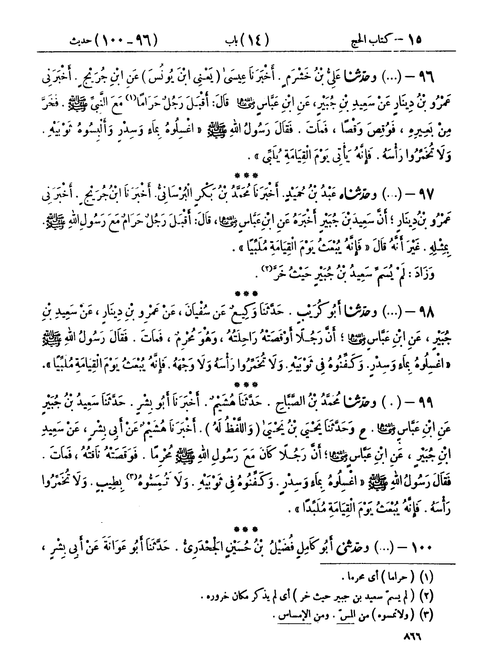 ٩٩ - (١٢٠٦) وحَدَّثَنَا مُحَمَّدُ بْنُ الصَّبَّاحِ، حَدَّثَنَا هُشَيْمٌ، أَخْبَرَنَا أَبُو بِشْرٍ، حَدَّثَنَا سَعِيدُ بْنُ جُبَيْرٍ، عَنِ ابْنِ عَبَّاسٍ رَضِيَ اللهُ عَنْهُمَا، ح وحَدَّثَنَا يَحْيَى بْنُ يَحْيَى - وَاللَّفْظُ لَهُ - أَخْبَرَنَا هُشَيْمٌ، عَنْ أَبِي بِشْرٍ، عَنْ سَعِيدِ بْنِ جُبَيْرٍ، عَنِ ابْنِ عَبَّاسٍ رَضِيَ اللهُ عَنْهُمَا، أَنَّ رَجُلًا كَانَ مَعَ رَسُولِ اللهِ صَلَّى اللهُ عَلَيْهِ وَسَلَّمَ مُحْرِمًا، فَوَقَصَتْهُ نَاقَتُهُ فَمَاتَ، فَقَالَ رَسُولُ اللهِ صَلَّى اللهُ عَلَيْهِ وَسَلَّمَ: «اغْسِلُوهُ بِمَاءٍ وَسِدْرٍ، وَكَفِّنُوهُ فِي ثَوْبَيْهِ، وَلَا تَمَسُّوهُ بِطِيبٍ، وَلَا تُخَمِّرُوا رَأْسَهُ، فَإِنَّهُ يُبْعَثُ يَوْمَ الْقِيَامَةِ مُلَبِّدًا»