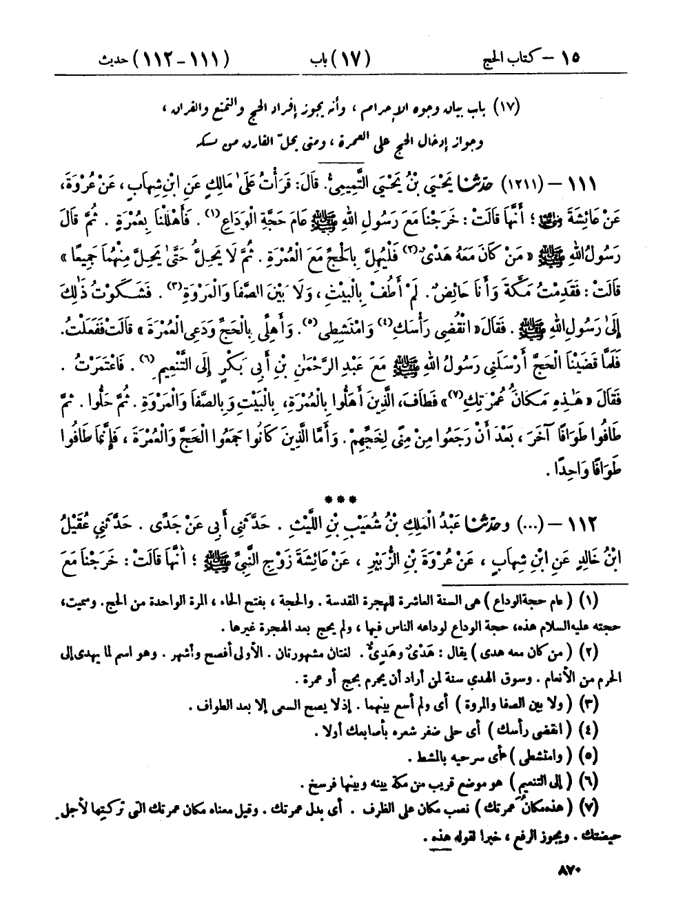١١١ - (١٢١١) حَدَّثَنَا يَحْيَى بْنُ يَحْيَى التَّمِيمِيُّ، قَالَ: قَرَأْتُ عَلَى مَالِكٍ، عَنِ ابْنِ شِهَابٍ، عَنْ عُرْوَةَ، عَنْ عَائِشَةَ رَضِيَ اللهُ عَنْهَا، أَنَّهَا قَالَتْ: خَرَجْنَا مَعَ رَسُولِ اللهِ صَلَّى اللهُ عَلَيْهِ وَسَلَّمَ عَامَ حَجَّةِ الْوَدَاعِ، فَأَهْلَلْنَا بِعُمْرَةٍ، ثُمَّ قَالَ رَسُولُ اللهِ صَلَّى اللهُ عَلَيْهِ وَسَلَّمَ: «مَنْ كَانَ مَعَهُ هَدْيٌ فَلْيُهِلَّ بِالْحَجِّ مَعَ الْعُمْرَةِ، ثُمَّ لَا يَحِلُّ حَتَّى يَحِلَّ مِنْهُمَا جَمِيعًا» قَالَتْ: فَقَدِمْتُ مَكَّةَ وَأَنَا حَائِضٌ، لَمْ أَطُفْ بِالْبَيْتِ، وَلَا بَيْنَ الصَّفَا وَالْمَرْوَةِ، فَشَكَوْتُ ذَلِكَ إِلَى رَسُولِ اللهِ صَلَّى اللهُ عَلَيْهِ وَسَلَّمَ، فَقَالَ: «انْقُضِي رَأْسَكِ وَامْتَشِطِي وَأَهِلِّي بِالْحَجِّ وَدَعِي الْعُمْرَةَ» قَالَتْ: فَفَعَلْتُ، فَلَمَّا قَضَيْنَا الْحَجَّ أَرْسَلَنِي رَسُولُ اللهِ صَلَّى اللهُ عَلَيْهِ وَسَلَّمَ مَعَ عَبْدِ الرَّحْمَنِ بْنِ أَبِي بَكْرٍ إِلَى التَّنْعِيمِ، فَاعْتَمَرْتُ، فَقَالَ: «هَذِهِ مَكَانُ عُمْرَتِكِ» فَطَافَ، الَّذِينَ أَهَلُّوا بِالْعُمْرَةِ، بِالْبَيْتِ وَبِالصَّفَا وَالْمَرْوَةِ، ثُمَّ حَلُّوا، ثُمَّ طَافُوا طَوَافًا آخَرَ، بَعْدَ أَنْ رَجَعُوا مِنْ مِنًى لِحَجِّهِمْ، وَأَمَّا الَّذِينَ كَانُوا جَمَعُوا الْحَجَّ وَالْعُمْرَةَ، فَإِنَّمَا طَافُوا طَوَافًا وَاحِدًا "