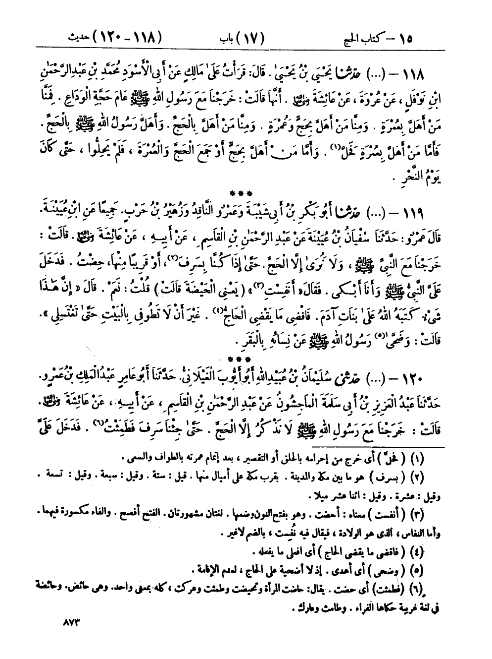 ١١٩ - (١٢١١) حَدَّثَنَا أَبُو بَكْرِ بْنُ أَبِي شَيْبَةَ، وَعَمْرٌو النَّاقِدُ، وَزُهَيْرُ بْنُ حَرْبٍ، جَمِيعًا عَنِ ابْنِ عُيَيْنَةَ، قَالَ عَمْرٌو: حَدَّثَنَا سُفْيَانُ بْنُ عُيَيْنَةَ، عَنْ عَبْدِ الرَّحْمَنِ بْنِ الْقَاسِمِ، عَنْ أَبِيهِ، عَنْ عَائِشَةَ رَضِيَ اللهُ عَنْهَا، قَالَتْ: خَرَجْنَا مَعَ النَّبِيِّ صَلَّى اللهُ عَلَيْهِ وَسَلَّمَ، وَلَا نَرَى إِلَّا الْحَجَّ، حَتَّى إِذَا كُنَّا بِسَرِفَ، أَوْ قَرِيبًا مِنْهَا، حِضْتُ فَدَخَلَ عَلَيَّ النَّبِيُّ صَلَّى اللهُ عَلَيْهِ وَسَلَّمَ وَأَنَا أَبْكِي، فَقَالَ: «أَنَفِسْتِ؟» - يَعْنِي الْحَيْضَةَ قَالَتْ - قُلْتُ: نَعَمْ، قَالَ: «إِنَّ هَذَا شَيْءٌ كَتَبَهُ اللهُ عَلَى بَنَاتِ آدَمَ، فَاقْضِي مَا يَقْضِي الْحَاجُّ، غَيْرَ أَنْ لَا تَطُوفِي بِالْبَيْتِ حَتَّى تَغْتَسِلِي» قَالَتْ: وَضَحَّى رَسُولُ اللهِ صَلَّى اللهُ عَلَيْهِ وَسَلَّمَ عَنْ نِسَائِهِ بِالْبَقَرِ
