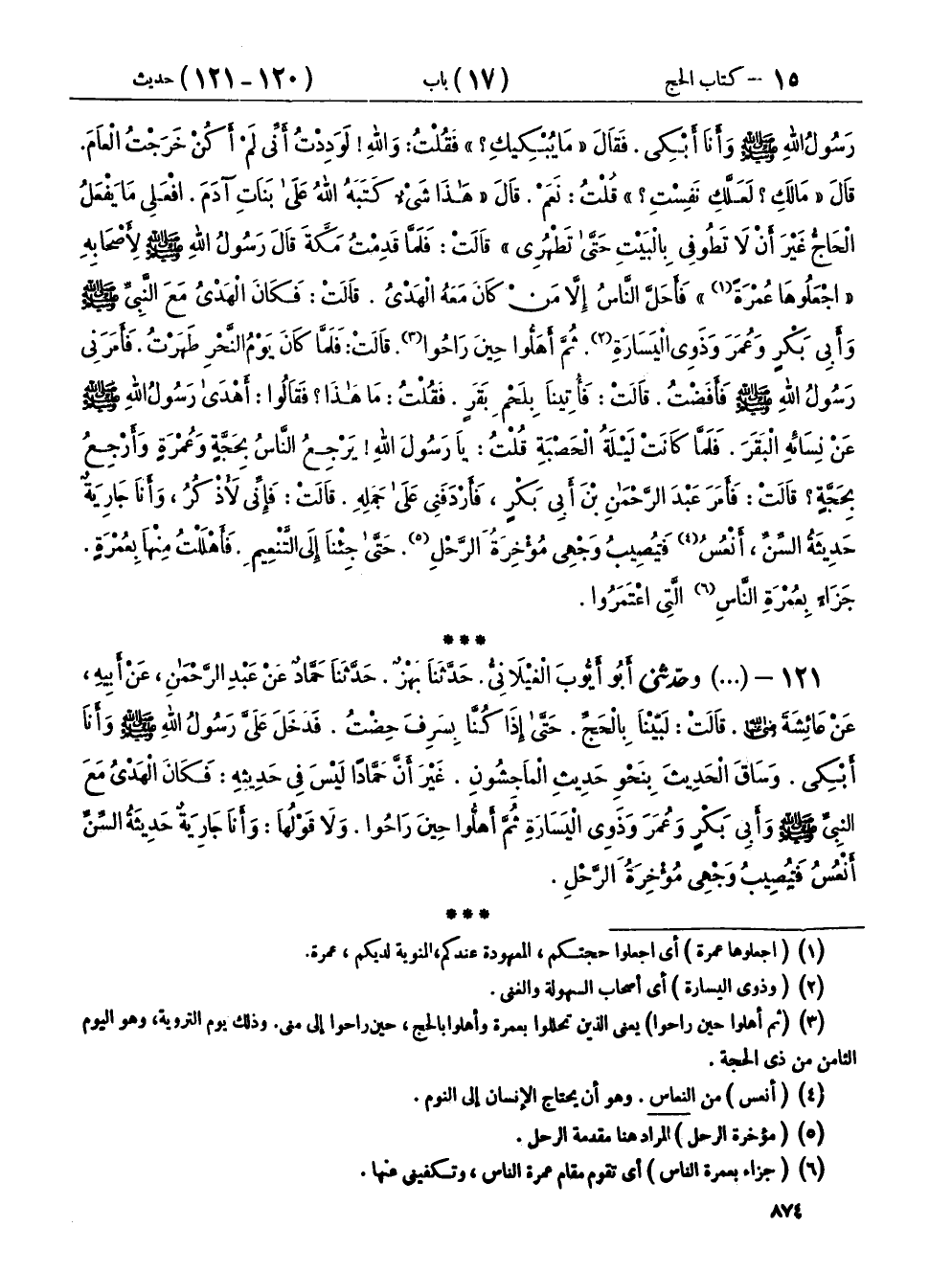 ١٢١ - (١٢١١) وحَدَّثَنِي أَبُو أَيُّوبَ الْغَيْلَانِيُّ، حَدَّثَنَا بَهْزٌ، حَدَّثَنَا حَمَّادٌ، عَنْ عَبْدِ الرَّحْمَنِ، عَنْ أَبِيهِ، عَنْ عَائِشَةَ رَضِيَ اللهُ عَنْهَا، قَالَتْ: لَبَّيْنَا بِالْحَجِّ حَتَّى إِذَا كُنَّا بِسَرِفَ حِضْتُ، فَدَخَلَ عَلَيَّ رَسُولُ اللهِ صَلَّى اللهُ عَلَيْهِ وَسَلَّمَ، وَأَنَا أَبْكِي، وَسَاقَ الْحَدِيثَ بِنَحْوِ حَدِيثِ الْمَاجِشُونِ، غَيْرَ أَنَّ حَمَّادًا لَيْسَ فِي حَدِيثِهِ: فَكَانَ الْهَدْيُ مَعَ النَّبِيِّ صَلَّى اللهُ عَلَيْهِ وَسَلَّمَ وَأَبِي بَكْرٍ، وَعُمَرَ، وَذَوِي الْيَسَارَةِ، ثُمَّ أَهَلُّوا حِينَ رَاحُوا وَلَا قَوْلُهَا وَأَنَا جَارِيَةٌ حَدِيثَةُ السِّنِّ أَنْعَسُ فَيُصِيبُ وَجْهِي مُؤْخِرَةَ الرَّحْلِ