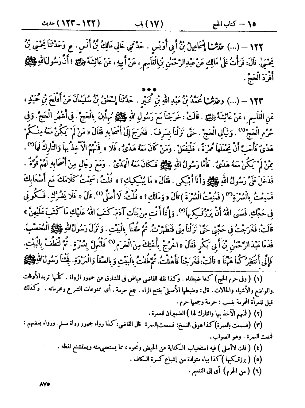 ١٢٢ - (١٢١١) حَدَّثَنَا إِسْمَاعِيلُ بْنُ أَبِي أُوَيْسٍ، حَدَّثَنِي خَالِي مَالِكُ بْنُ أَنَسٍ، ح وحَدَّثَنَا يَحْيَى بْنُ يَحْيَى، قَالَ: قَرَأْتُ عَلَى مَالِكٍ، عَنْ عَبْدِ الرَّحْمَنِ بْنِ الْقَاسِمِ، عَنْ أَبِيهِ، عَنْ عَائِشَةَ رَضِيَ اللهُ عَنْهَا: «أَنَّ رَسُولَ اللهِ صَلَّى اللهُ عَلَيْهِ وَسَلَّمَ أَفْرَدَ الْحَجَّ»