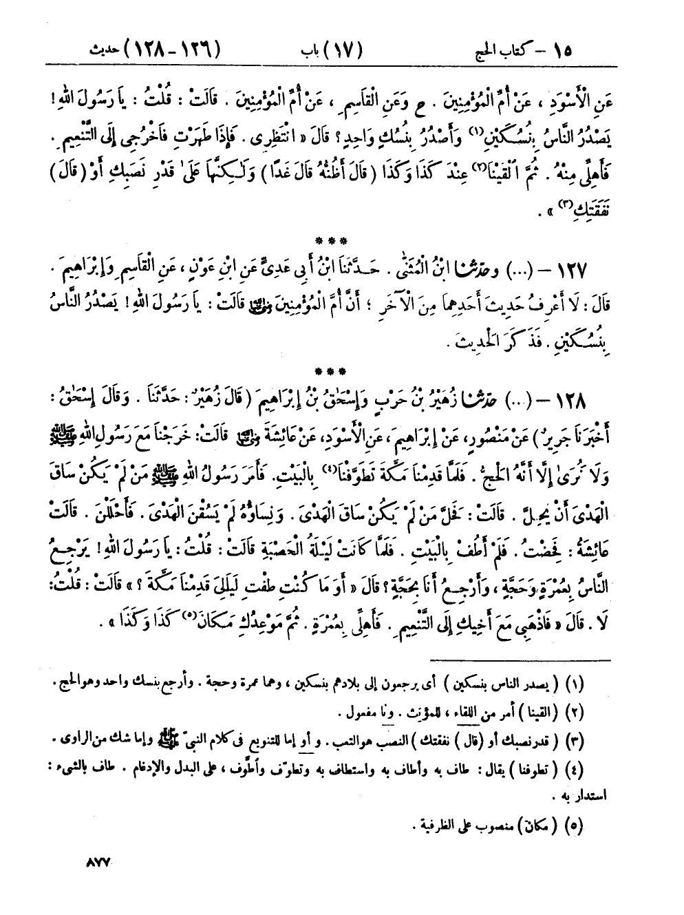 ١٢٧ - (١٢١١) وحَدَّثَنَا ابْنُ الْمُثَنَّى، حَدَّثَنَا ابْنُ أَبِي عَدِيٍّ، عَنِ ابْنِ عَوْنٍ، عَنِ الْقَاسِمِ، وَإِبْرَاهِيمَ، قَالَ: لَا أَعْرِفُ حَدِيثَ أَحَدِهِمَا مِنَ الْآخَرِ، أَنَّ أُمَّ الْمُؤْمِنِينَ رَضِيَ اللهُ عَنْهَا، قَالَتْ: يَا رَسُولَ اللهِ، يَصْدُرُ النَّاسُ بِنُسُكَيْنِ فَذَكَرَ الْحَدِيثَ