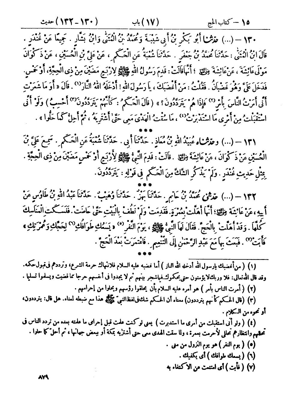 ١٣٠ - (١٢١١) حَدَّثَنَا أَبُو بَكْرِ بْنُ أَبِي شَيْبَةَ، وَمُحَمَّدُ بْنُ الْمُثَنَّى، وَابْنُ بَشَّارٍ، جَمِيعًا عَنْ غُنْدَرٍ، قَالَ ابْنُ الْمُثَنَّى: حَدَّثَنَا مُحَمَّدُ بْنُ جَعْفَرٍ، حَدَّثَنَا شُعْبَةُ، عَنِ الْحَكَمِ، عَنْ عَلِيِّ بْنِ الْحُسَيْنِ، عَنْ ذَكْوَانَ، مَوْلَى عَائِشَةَ، عَنْ عَائِشَةَ رَضِيَ اللهُ عَنْهَا، أَنَّهَا قَالَتْ: قَدِمَ رَسُولُ اللهِ صَلَّى اللهُ عَلَيْهِ وَسَلَّمَ لِأَرْبَعٍ مَضَيْنَ مِنْ ذِي الْحِجَّةِ، أَوْ خَمْسٍ، فَدَخَلَ عَلَيَّ وَهُوَ غَضْبَانُ فَقُلْتُ: مَنْ أَغْضَبَكَ، يَا رَسُولَ اللهِ؟ أَدْخَلَهُ اللهُ النَّارَ، قَالَ: «أَوَمَا شَعَرْتِ أَنِّي أَمَرْتُ النَّاسَ بِأَمْرٍ، فَإِذَا هُمْ يَتَرَدَّدُونَ؟» - قَالَ الْحَكَمُ: كَأَنَّهُمْ يَتَرَدَّدُونَ أَحْسِبُ - «وَلَوْ أَنِّي اسْتَقْبَلْتُ مِنْ أَمْرِي مَا اسْتَدْبَرْتُ، مَا سُقْتُ الْهَدْيَ مَعِي حَتَّى أَشْتَرِيَهُ، ثُمَّ أَحِلُّ كَمَا حَلُّوا»