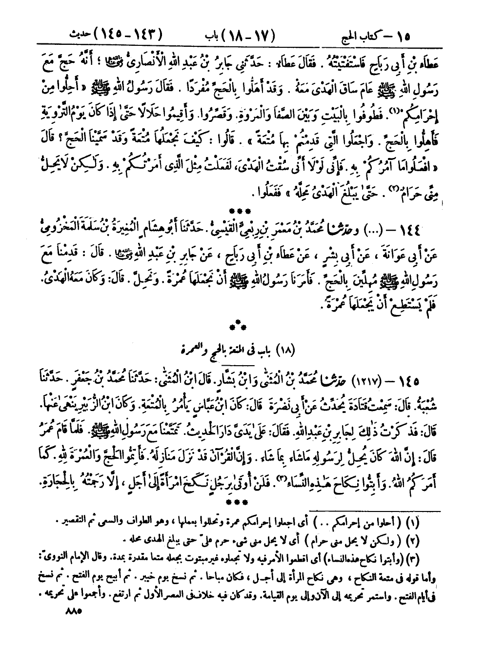 ١٤٤ - (١٢١٦) وحَدَّثَنَا مُحَمَّدُ بْنُ مَعْمَرِ بْنِ رِبْعِيٍّ الْقَيْسِيُّ، حَدَّثَنَا أَبُو هِشَامٍ الْمُغِيرَةُ بْنُ سَلَمَةَ الْمَخْزُومِيُّ، عَنْ أَبِي عَوَانَةَ، عَنْ أَبِي بِشْرٍ، عَنْ عَطَاءِ بْنِ أَبِي رَبَاحٍ، عَنْ جَابِرِ بْنِ عَبْدِ اللهِ رَضِيَ اللهُ عَنْهُمَا، قَالَ: قَدِمْنَا مَعَ رَسُولِ اللهِ صَلَّى اللهُ عَلَيْهِ وَسَلَّمَ مُهِلِّينَ بِالْحَجِّ، " فَأَمَرَنَا رَسُولُ اللهِ صَلَّى اللهُ عَلَيْهِ وَسَلَّمَ أَنْ نَجْعَلَهَا عُمْرَةً وَنَحِلَّ، قَالَ: وَكَانَ مَعَهُ الْهَدْيُ، فَلَمْ يَسْتَطِعْ أَنْ يَجْعَلَهَا عُمْرَةً "