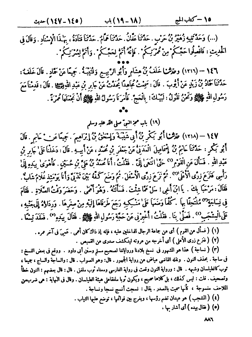 ١٤٧ - (١٢١٨) حَدَّثَنَا أَبُو بَكْرِ بْنُ أَبِي شَيْبَةَ، وَإِسْحَاقُ بْنُ إِبْرَاهِيمَ، جَمِيعًا عَنْ حَاتِمٍ، قَالَ أَبُو بَكْرٍ: حَدَّثَنَا حَاتِمُ بْنُ إِسْمَاعِيلَ الْمَدَنِيُّ، عَنْ جَعْفَرِ بْنِ مُحَمَّدٍ، عَنْ أَبِيهِ، قَالَ: دَخَلْنَا عَلَى جَابِرِ بْنِ عَبْدِ اللهِ، فَسَأَلَ عَنِ الْقَوْمِ حَتَّى انْتَهَى إِلَيَّ، فَقُلْتُ: أَنَا مُحَمَّدُ بْنُ عَلِيِّ بْنِ حُسَيْنٍ، فَأَهْوَى بِيَدِهِ إِلَى رَأْسِي فَنَزَعَ زِرِّي الْأَعْلَى، ثُمَّ نَزَعَ زِرِّي الْأَسْفَلَ، ثُمَّ وَضَعَ كَفَّهُ بَيْنَ ثَدْيَيَّ وَأَنَا يَوْمَئِذٍ غُلَامٌ شَابٌّ، فَقَالَ: مَرْحَبًا بِكَ، يَا ابْنَ أَخِي، سَلْ عَمَّا شِئْتَ، فَسَأَلْتُهُ، وَهُوَ أَعْمَى، وَحَضَرَ وَقْتُ الصَّلَاةِ، فَقَامَ فِي نِسَاجَةٍ مُلْتَحِفًا بِهَا، كُلَّمَا وَضَعَهَا عَلَى مَنْكِبِهِ رَجَعَ طَرَفَاهَا إِلَيْهِ مِنْ صِغَرِهَا، وَرِدَاؤُهُ إِلَى جَنْبِهِ، عَلَى الْمِشْجَبِ، فَصَلَّى بِنَا، فَقُلْتُ: أَخْبِرْنِي عَنْ حَجَّةِ رَسُولِ اللهِ صَلَّى اللهُ عَلَيْهِ وَسَلَّمَ، فَقَالَ: بِيَدِهِ فَعَقَدَ تِسْعًا ⦗٨٨٧⦘، فَقَالَ: إِنَّ رَسُولَ اللهِ صَلَّى اللهُ عَلَيْهِ وَسَلَّمَ مَكَثَ تِسْعَ سِنِينَ لَمْ يَحُجَّ، ثُمَّ أَذَّنَ فِي النَّاسِ فِي الْعَاشِرَةِ، أَنَّ رَسُولَ اللهِ صَلَّى اللهُ عَلَيْهِ وَسَلَّمَ حَاجٌّ، فَقَدِمَ الْمَدِينَةَ بَشَرٌ كَثِيرٌ، كُلُّهُمْ يَلْتَمِسُ أَنْ يَأْتَمَّ بِرَسُولِ اللهِ صَلَّى اللهُ عَلَيْهِ وَسَلَّمَ، وَيَعْمَلَ مِثْلَ عَمَلِهِ، فَخَرَجْنَا مَعَهُ، حَتَّى أَتَيْنَا ذَا الْحُلَيْفَةِ، فَوَلَدَتْ أَسْمَاءُ بِنْتُ عُمَيْسٍ مُحَمَّدَ بْنَ أَبِي بَكْرٍ، فَأَرْسَلَتْ إِلَى رَسُولِ اللهِ صَلَّى اللهُ عَلَيْهِ وَسَلَّمَ: كَيْفَ أَصْنَعُ؟ قَالَ: «اغْتَسِلِي، وَاسْتَثْفِرِي بِثَوْبٍ وَأَحْرِمِي» فَصَلَّى رَسُولُ اللهِ صَلَّى اللهُ عَلَيْهِ وَسَلَّمَ فِي الْمَسْجِدِ، ثُمَّ رَكِبَ الْقَصْوَاءَ، حَتَّى إِذَا اسْتَوَتْ بِهِ نَاقَتُهُ عَلَى الْبَيْدَاءِ، نَظَرْتُ إِلَى مَدِّ بَصَرِي بَيْنَ يَدَيْهِ، مِنْ رَاكِبٍ وَمَاشٍ، وَعَنْ يَمِينِهِ مِثْلَ ذَلِكَ، وَعَنْ يَسَارِهِ مِثْلَ ذَلِكَ، وَمِنْ خَلْفِهِ مِثْلَ ذَلِكَ، وَرَسُولُ اللهِ صَلَّى اللهُ عَلَيْهِ وَسَلَّمَ بَيْنَ أَظْهُرِنَا، وَعَلَيْهِ يَنْزِلُ الْقُرْآنُ، وَهُوَ يَعْرِفُ تَأْوِيلَهُ، وَمَا عَمِلَ بِهِ مِنْ شَيْءٍ عَمِلْنَا بِهِ، فَأَهَلَّ بِالتَّوْحِيدِ «لَبَّيْكَ اللهُمَّ، لَبَّيْكَ، لَبَّيْكَ لَا شَرِيكَ لَكَ لَبَّيْكَ، إِنَّ الْحَمْدَ وَالنِّعْمَةَ لَكَ، وَالْمُلْكَ لَا شَرِيكَ لَكَ» وَأَهَلَّ النَّاسُ بِهَذَا الَّذِي يُهِلُّونَ بِهِ، فَلَمْ يَرُدَّ رَسُولُ اللهِ صَلَّى اللهُ عَلَيْهِ وَسَلَّمَ عَلَيْهِمْ شَيْئًا مِنْهُ، وَلَزِمَ رَسُولُ اللهِ صَلَّى اللهُ عَلَيْهِ وَسَلَّمَ تَلْبِيَتَهُ، قَالَ جَابِرٌ رَضِيَ اللهُ عَنْهُ: لَسْنَا نَنْوِي إِلَّا الْحَجَّ، لَسْنَا نَعْرِفُ الْعُمْرَةَ، حَتَّى إِذَا أَتَيْنَا الْبَيْتَ مَعَهُ، اسْتَلَمَ الرُّكْنَ فَرَمَلَ ثَلَاثًا وَمَشَى أَرْبَعًا، ثُمَّ نَفَذَ إِلَى مَقَامِ إِبْرَاهِيمَ عَلَيْهِ السَّلَام، فَقَرَأَ: {وَاتَّخِذُوا مِنْ مَقَامِ إِبْرَاهِيمَ مُصَلًّى} [البقرة: ١٢٥] فَجَعَلَ الْمَقَامَ بَيْنَهُ وَبَيْنَ الْبَيْتِ، فَكَانَ أَبِي ⦗٨٨٨⦘ يَقُولُ - وَلَا أَعْلَمُهُ ذَكَرَهُ إِلَّا عَنِ النَّبِيِّ صَلَّى اللهُ عَلَيْهِ وَسَلَّمَ -: كَانَ يَقْرَأُ فِي الرَّكْعَتَيْنِ قُلْ هُوَ اللهُ أَحَدٌ وَقُلْ يَا أَيُّهَا الْكَافِرُونَ، ثُمَّ رَجَعَ إِلَى الرُّكْنِ فَاسْتَلَمَهُ، ثُمَّ خَرَجَ مِنَ الْبَابِ إِلَى الصَّفَا، فَلَمَّا دَنَا مِنَ الصَّفَا قَرَأَ: {إِنَّ الصَّفَا والْمَرْوَةَ مِنْ شَعَائ
