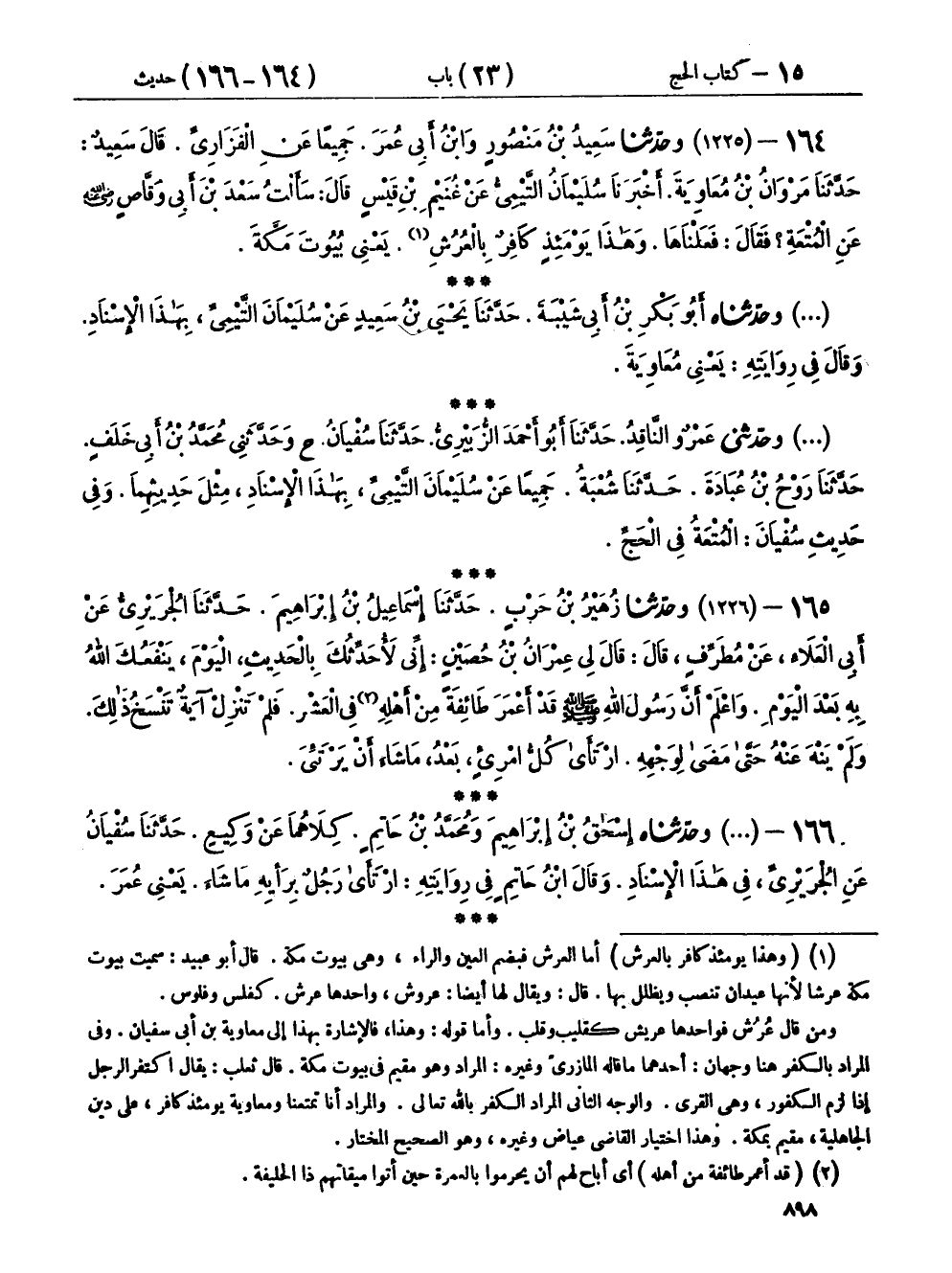 ١٦٤ - (١٢٢٥) وحَدَّثَنَا سَعِيدُ بْنُ مَنْصُورٍ، وَابْنُ أَبِي عُمَرَ، جَمِيعًا عَنِ الْفَزَارِيِّ، قَالَ سَعِيدٌ: حَدَّثَنَا مَرْوَانُ بْنُ مُعَاوِيَةَ، أَخْبَرَنَا سُلَيْمَانُ التَّيْمِيُّ، عَنْ غُنَيْمِ بْنِ قَيْسٍ، قَالَ: سَأَلْتُ سَعْدَ بْنَ أَبِي وَقَّاصٍ رَضِيَ اللهُ عَنْهُ عَنِ الْمُتْعَةِ؟ فَقَالَ: «فَعَلْنَاهَا وَهَذَا يَوْمَئِذٍ كَافِرٌ بِالْعُرُشِ، يَعْنِي بُيُوتَ مَكَّةَ»