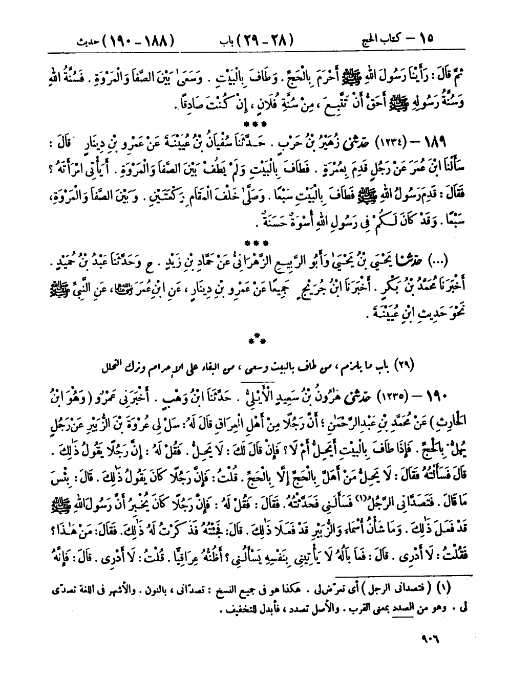 ١٩٠ - (١٢٣٥) حَدَّثَنِي هَارُونُ بْنُ سَعِيدٍ الْأَيْلِيُّ، حَدَّثَنَا ابْنُ وَهْبٍ، أَخْبَرَنِي عَمْرٌو وَهُوَ ابْنُ الْحَارِثِ، عَنْ مُحَمَّدِ بْنِ عَبْدِ الرَّحْمَنِ، أَنَّ رَجُلًا مِنْ أَهْلِ الْعِرَاقِ قَالَ لَهُ: سَلْ لِي عُرْوَةَ بْنَ الزُّبَيْرِ عَنْ رَجُلٍ يُهِلُّ بِالْحَجِّ، فَإِذَا طَافَ بِالْبَيْتِ أَيَحِلُّ أَمْ لَا؟ فَإِنْ قَالَ لَكَ: لَا يَحِلُّ، فَقُلْ لَهُ: إِنَّ رَجُلًا يَقُولُ ذَلِكَ، قَالَ فَسَأَلْتُهُ فَقَالَ: لَا يَحِلُّ مَنْ أَهَلَّ بِالْحَجِّ إِلَّا بِالْحَجِّ، قُلْتُ: فَإِنَّ رَجُلًا كَانَ يَقُولُ ذَلِكَ، قَالَ: بِئْسَ مَا قَالَ، فَتَصَدَّانِي الرَّجُلُ فَسَأَلَنِي فَحَدَّثْتُهُ، فَقَالَ: فَقُلْ لَهُ: فَإِنَّ رَجُلًا كَانَ يُخْبِرُ أَنَّ رَسُولَ اللهِ صَلَّى اللهُ عَلَيْهِ وَسَلَّمَ قَدْ فَعَلَ ذَلِكَ، وَمَا شَأْنُ أَسْمَاءَ وَالزُّبَيْرِ قَدْ فَعَلَا ذَلِكَ، قَالَ: فَجِئْتُهُ فَذَكَرْتُ لَهُ ذَلِكَ، فَقَالَ: مَنْ هَذَا؟ فَقُلْتُ: لَا أَدْرِي، قَالَ: فَمَا بَالُهُ لَا يَأْتِينِي بِنَفْسِهِ يَسْأَلُنِي؟ أَظُنُّهُ عِرَاقِيًّا، قُلْتُ: لَا أَدْرِي، قَالَ: فَإِنَّهُ قَدْ كَذَبَ، قَدْ حَجَّ رَسُولُ اللهِ صَلَّى اللهُ عَلَيْهِ وَسَلَّمَ فَأَخْبَرَتْنِي عَائِشَةُ رَضِيَ اللهُ عَنْهَا: «أَنَّ أَوَّلَ شَيْءٍ بَدَأَ بِهِ حِينَ قَدِمَ مَكَّةَ أَنَّهُ تَوَضَّأَ، ثُمَّ طَافَ بِالْبَيْتِ، ثُمَّ حَجَّ» أَبُو بَكْرٍ فَكَانَ أَوَّلَ شَيْءٍ بَدَأَ بِهِ الطَّوَافُ بِالْبَيْتِ، ثُمَّ لَمْ يَكُنْ غَيْرُهُ، ثُمَّ عُمَرُ مِثْلُ ذَلِكَ، ثُمَّ حَجَّ عُثْمَانُ فَرَأَيْتُهُ أَوَّلُ شَيْءٍ بَدَأَ بِهِ الطَّوَافُ بِالْبَيْتِ، ثُمَّ لَمْ يَكُنْ غَيْرُهُ، ثُمَّ مُعَاوِيَةُ وَعَبْدُ اللهِ بْنُ عُمَرَ، ثُمَّ حَجَجْتُ مَعَ أَبِي الزُّبَيْرِ بْنِ الْعَوَّامِ، فَكَانَ أَوَّلَ شَيْءٍ بَدَأَ بِهِ الطَّوَافُ بِالْبَيْتِ، ثُمَّ لَمْ يَكُنْ غَيْرُهُ، ثُمَّ رَأَيْتُ الْمُهَاجِرِينَ وَالْأَنْصَارَ يَفْعَلُونَ ذَلِكَ، ثُمَّ لَمْ يَكُنْ غَيْرُهُ، ثُمَّ آخِرُ مَنْ رَأَيْتُ فَعَلَ ذَلِكَ ابْنُ عُمَرَ، ثُمَّ لَمْ يَنْقُضْهَا بِعُمْرَةٍ، وَهَذَا ابْنُ عُمَرَ عِنْدَهُمْ أَفَلَا يَسْأَلُونَهُ؟ وَلَا أَحَدٌ مِمَّنْ مَضَى مَا كَانُوا يَبْدَءُونَ بِشَيْءٍ حِينَ يَضَعُونَ أَقْدَامَهُمْ أَوَّلَ مِنَ الطَّوَافِ بِالْبَيْتِ، ثُمَّ لَا يَحِلُّونَ، وَقَدْ رَأَيْتُ أُمِّي وَخَالَتِي حِينَ تَقْدَمَانِ لَا تَبْدَآنِ بِشَيْءٍ أَوَّلَ مِنَ الْبَيْتِ تَطُوفَانِ بِهِ، ثُمَّ لَا تَحِلَّانِ، وَقَدْ أَخْبَرَتْنِي أُمِّي أَنَّهَا أَقْبَلَتْ هِيَ وَأُخْتُهَا وَالزُّبَيْرُ وَفُلَانٌ وَفُلَانٌ بِعُمْرَةٍ قَطُّ، فَلَمَّا مَسَحُوا الرُّكْنَ حَلُّوا وَقَدْ كَذَبَ فِيمَا ذَكَرَ مِنْ ذَلِكَ