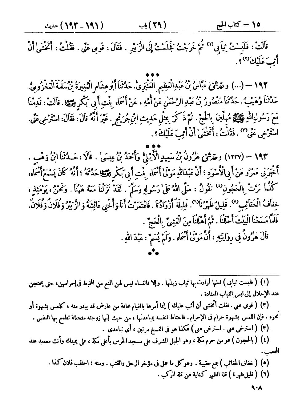١٩٣ - (١٢٣٧) وحَدَّثَنِي هَارُونُ بْنُ سَعِيدٍ الْأَيْلِيُّ، وَأَحْمَدُ بْنُ عِيسَى، قَالَا: حَدَّثَنَا ابْنُ وَهْبٍ، أَخْبَرَنِي عَمْرٌو، عَنْ أَبِي الْأَسْوَدِ، أَنَّ عَبْدَ اللهِ، مَوْلَى أَسْمَاءَ بِنْتِ أَبِي بَكْرٍ رَضِيَ اللهُ عَنْهُمَا حَدَّثَهُ، أَنَّهُ كَانَ يَسْمَعُ أَسْمَاءَ كُلَّمَا مَرَّتْ بِالْحَجُونِ تَقُولُ: «صَلَّى الله عَلَى رَسُولِهِ وَسَلَّمَ، لَقَدْ نَزَلْنَا مَعَهُ هَاهُنَا، وَنَحْنُ يَوْمَئِذٍ خِفَافُ الْحَقَائِبِ، قَلِيلٌ ظَهْرُنَا قَلِيلَةٌ أَزْوَادُنَا، فَاعْتَمَرْتُ أَنَا وَأُخْتِي عَائِشَةُ وَالزُّبَيْرُ وَفُلَانٌ وَفُلَانٌ، فَلَمَّا مَسَحْنَا الْبَيْتَ أَحْلَلْنَا، ثُمَّ أَهْلَلْنَا مِنَ الْعَشِيِّ بِالْحَجِّ» قَالَ هَارُونُ فِي رِوَايَتِهِ: أَنَّ مَوْلَى أَسْمَاءَ، وَلَمْ يُسَمِّ: عَبْدَ اللهِ