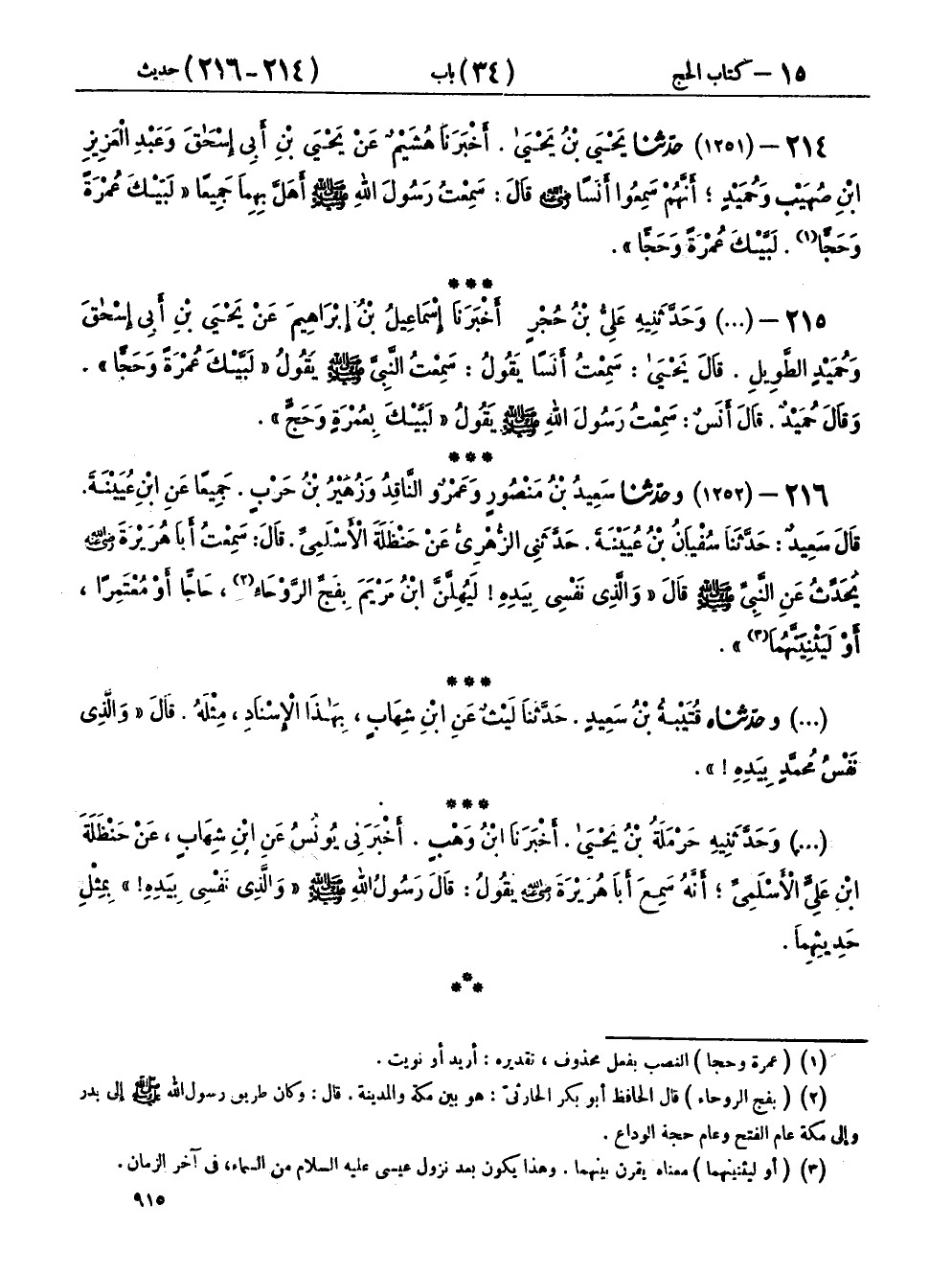 ٢١٦ - (١٢٥٢) وحَدَّثَنَا سَعِيدُ بْنُ مَنْصُورٍ، وَعَمْرٌو النَّاقِدُ، وَزُهَيْرُ بْنُ حَرْبٍ، جَمِيعًا عَنِ ابْنِ عُيَيْنَةَ، قَالَ سَعِيدٌ: حَدَّثَنَا سُفْيَانُ بْنُ عُيَيْنَةَ، حَدَّثَنِي الزُّهْرِيُّ، عَنْ حَنْظَلَةَ الْأَسْلَمِيِّ، قَالَ: سَمِعْتُ أَبَا هُرَيْرَةَ رَضِيَ اللهُ عَنْهُ، يُحَدِّثُ عَنِ النَّبِيِّ صَلَّى اللهُ عَلَيْهِ وَسَلَّمَ قَالَ: «وَالَّذِي نَفْسِي بِيَدِهِ، لَيُهِلَّنَّ ابْنُ مَرْيَمَ بِفَجِّ الرَّوْحَاءِ، حَاجًّا أَوْ مُعْتَمِرًا، أَوْ لَيَثْنِيَنَّهُمَا»