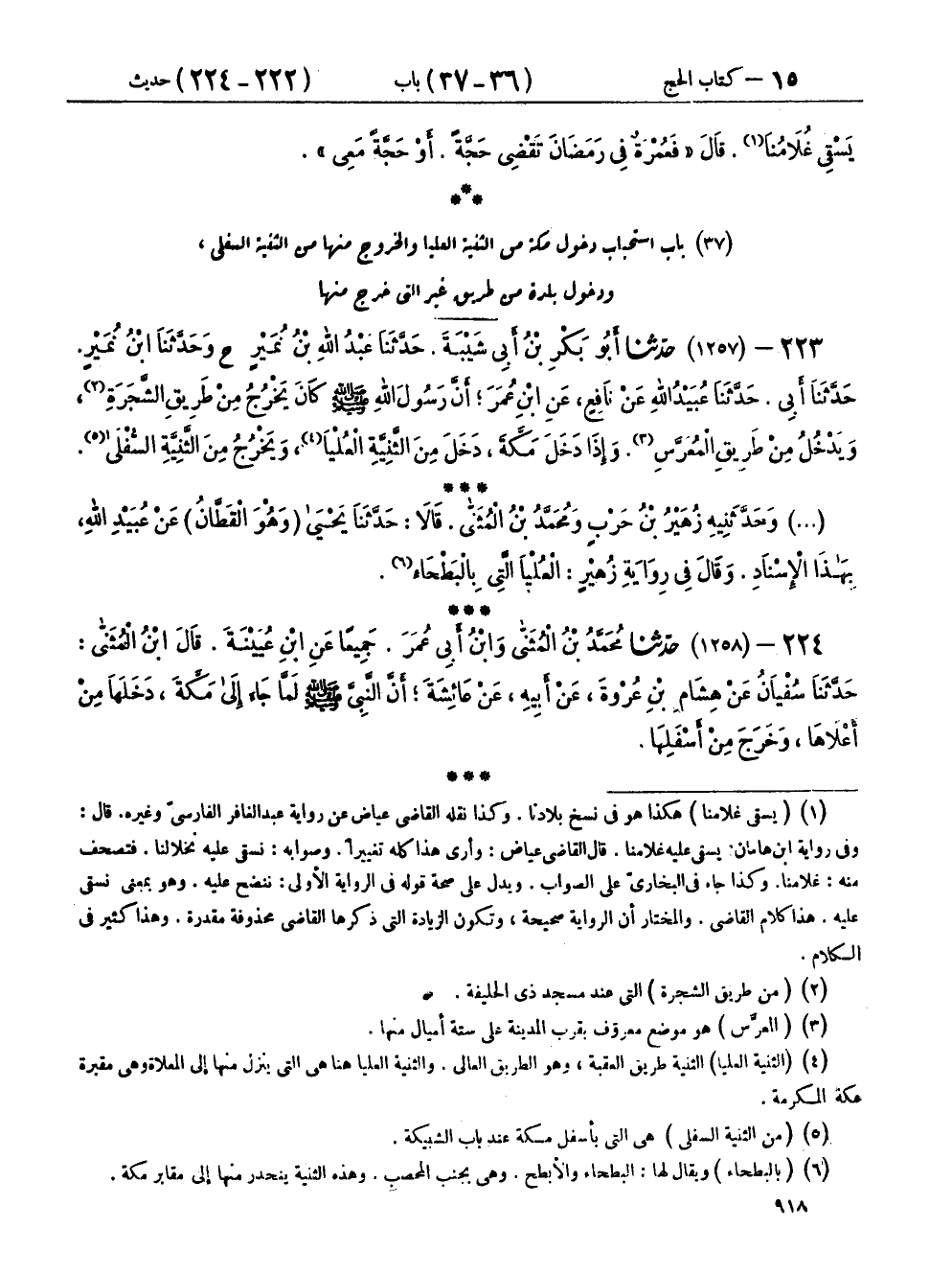 [ ش (من طريق الشجرة) التي عند مسجد ذي الحليفة (المعرس) هو موضع معروف بقرب المدينة على ستة أميال منها (الثنية العليا) الثنية طريق العقبة وهو الطريق العالي والثنية العليا هنا هي التي ينزل منها إلى المعلاة وهي مقبرة مكة المكرمة (من الثنية السفلى) هي التي بأسفل مكة عند باب الشبيكة]