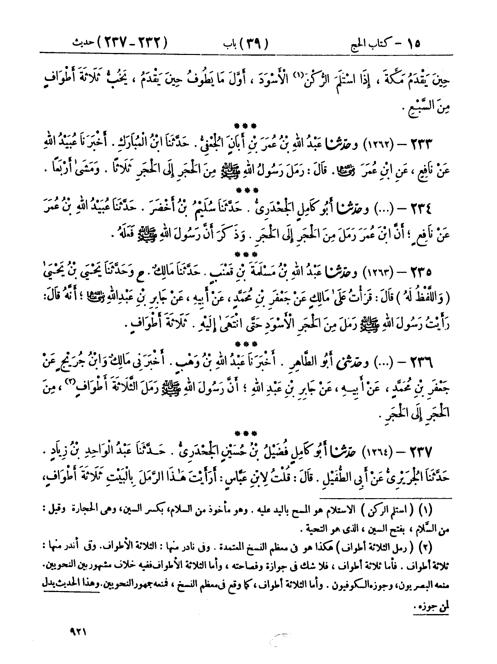 ٢٣٥ - (١٢٦٣) وحَدَّثَنَا عَبْدُ اللهِ بْنُ مَسْلَمَةَ بْنِ قَعْنَبٍ، حَدَّثَنَا مَالِكٌ، ح وحَدَّثَنَا يَحْيَى بْنُ يَحْيَى، - وَاللَّفْظُ لَهُ - قَالَ: قَرَأْتُ عَلَى مَالِكٍ، عَنْ جَعْفَرِ بْنِ مُحَمَّدٍ، عَنْ أَبِيهِ، عَنْ جَابِرِ بْنِ عَبْدِ اللهِ رَضِيَ اللهُ عَنْهُمَا، أَنَّهُ قَالَ: «رَأَيْتُ رَسُولَ اللهِ صَلَّى اللهُ عَلَيْهِ وَسَلَّمَ رَمَلَ مِنَ الْحَجَرِ الْأَسْوَدِ، حَتَّى انْتَهَى إِلَيْهِ، ثَلَاثَةَ أَطْوَافٍ»